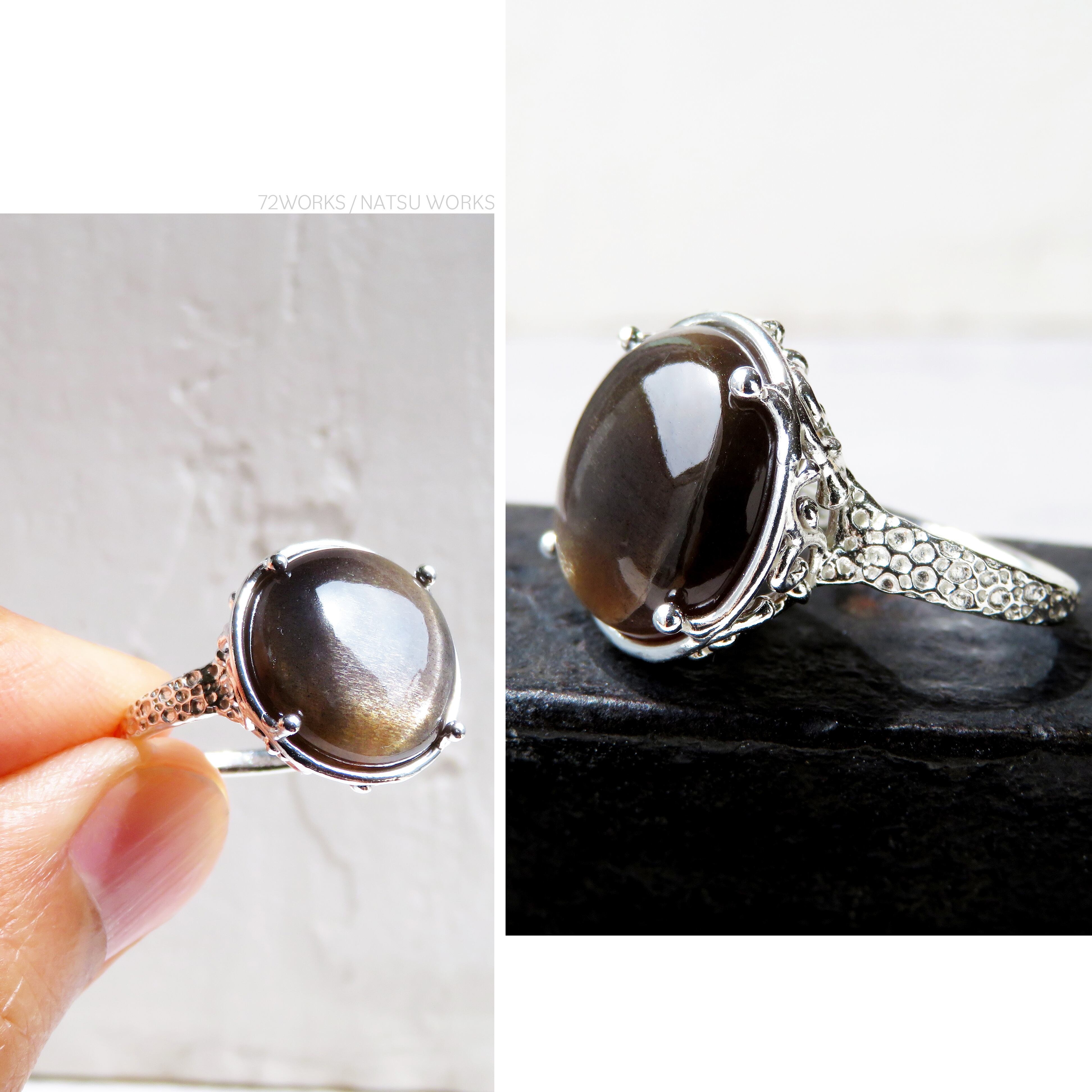 ダークトーンの中にゴールドが輝くムーンストーンを、透かし模様の台座にセッティングしました。