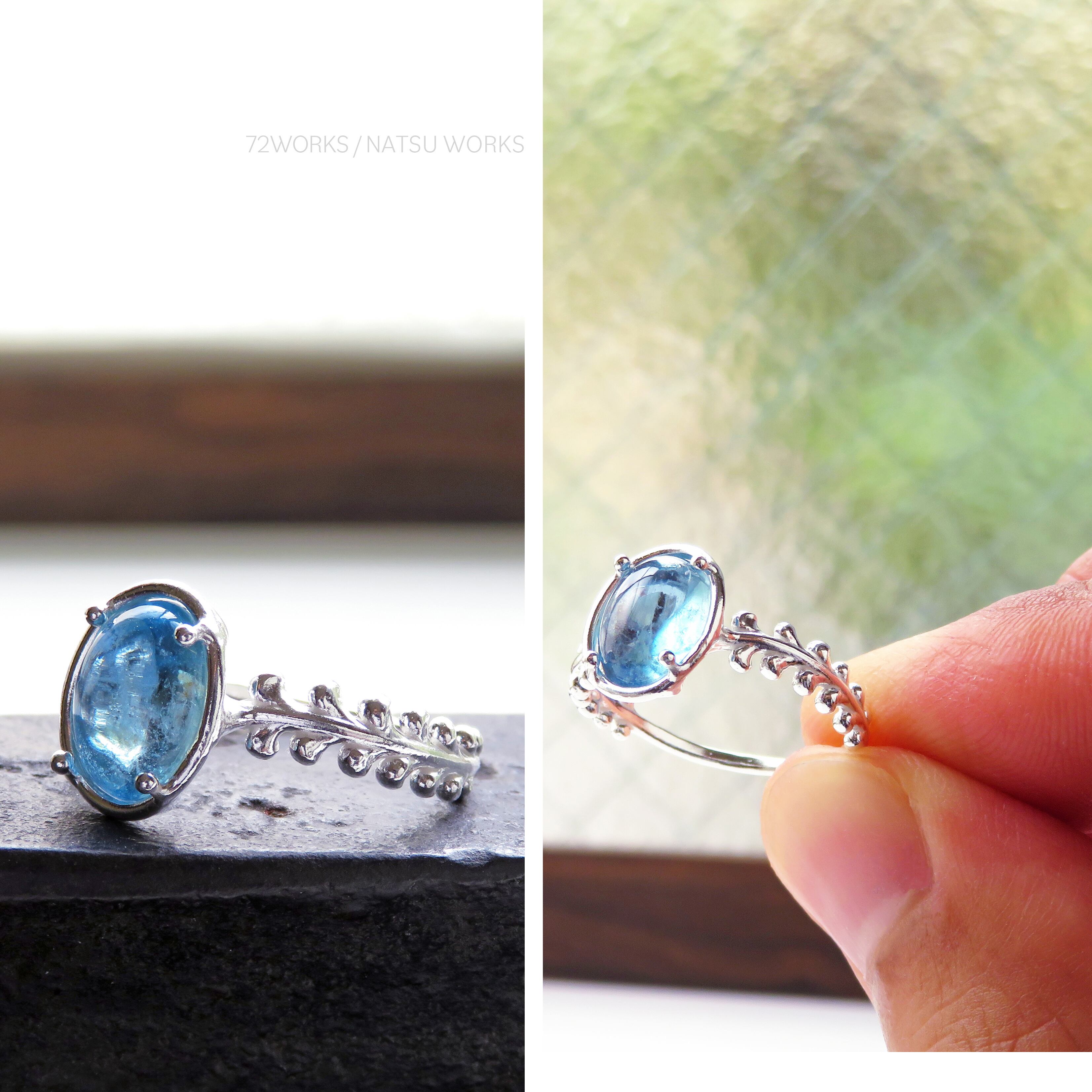 涼しげなブルーが映えるアクアマリンを、ボタニカルなイメージのリングにセッティングしました。