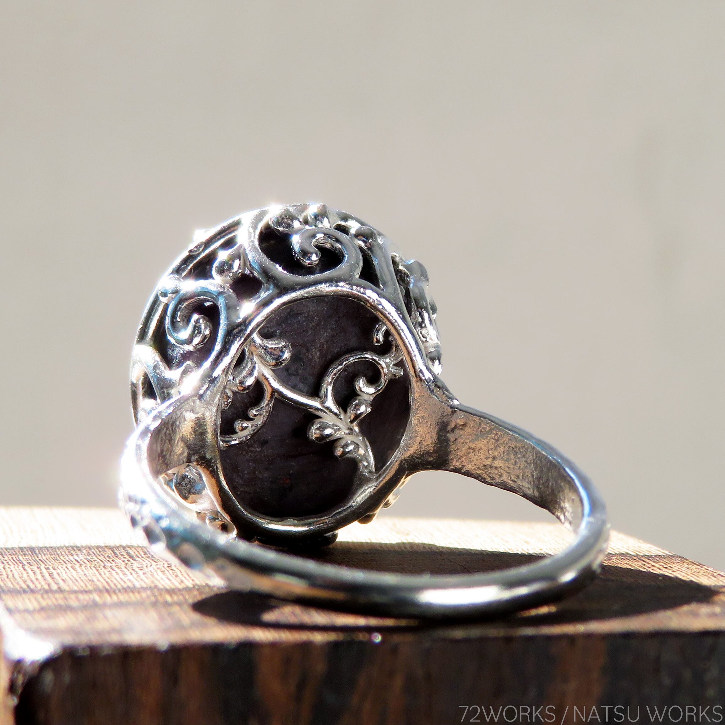 特徴的なカラーに六条スターが映えるルビーを、透かし模様の台座にセッティングしました。