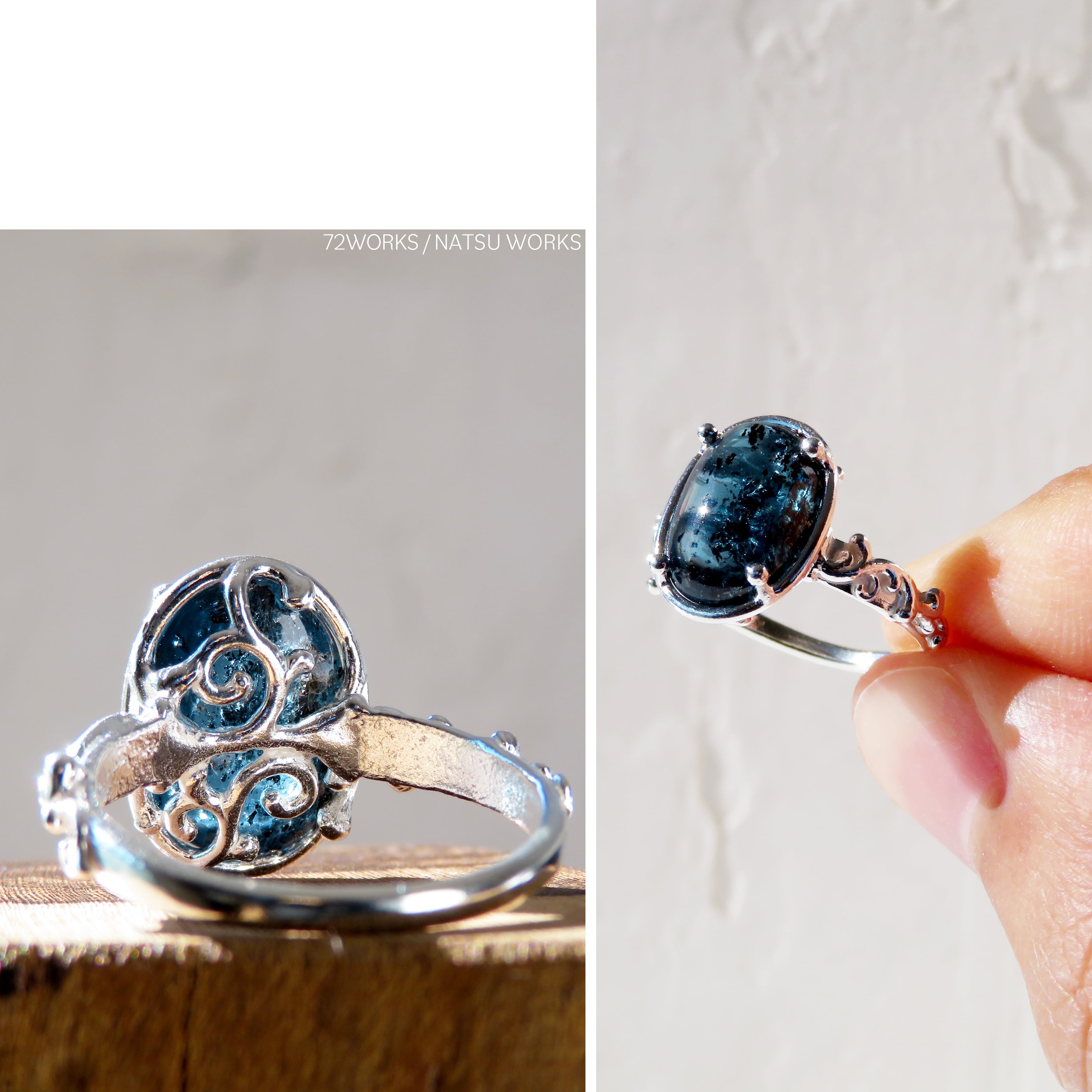独特のブルーが映えるカイヤナイトを、唐草と透かし模様の台座にセットしました。