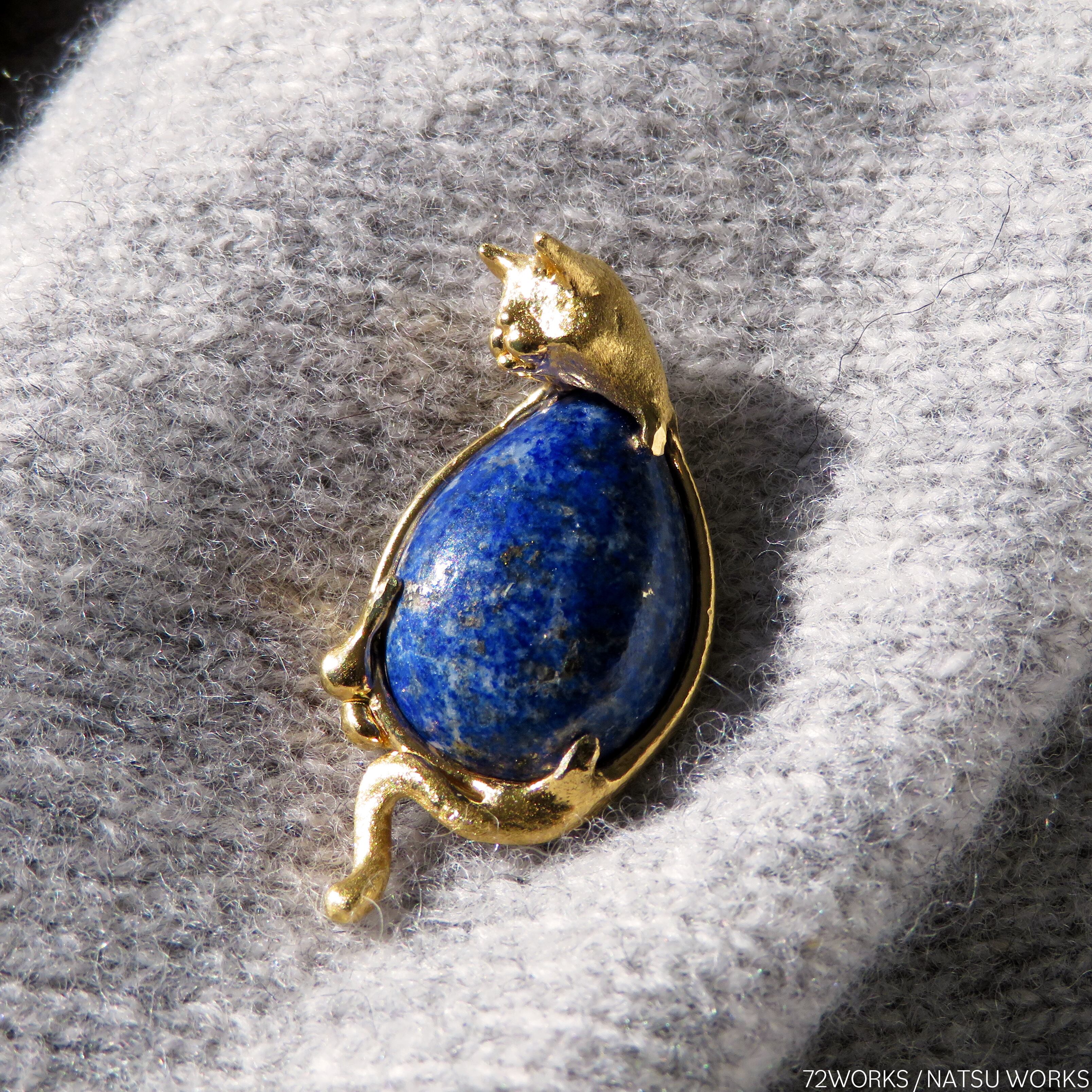 18金コーティングを施した猫に、ラピスラズリを留めたブローチ。