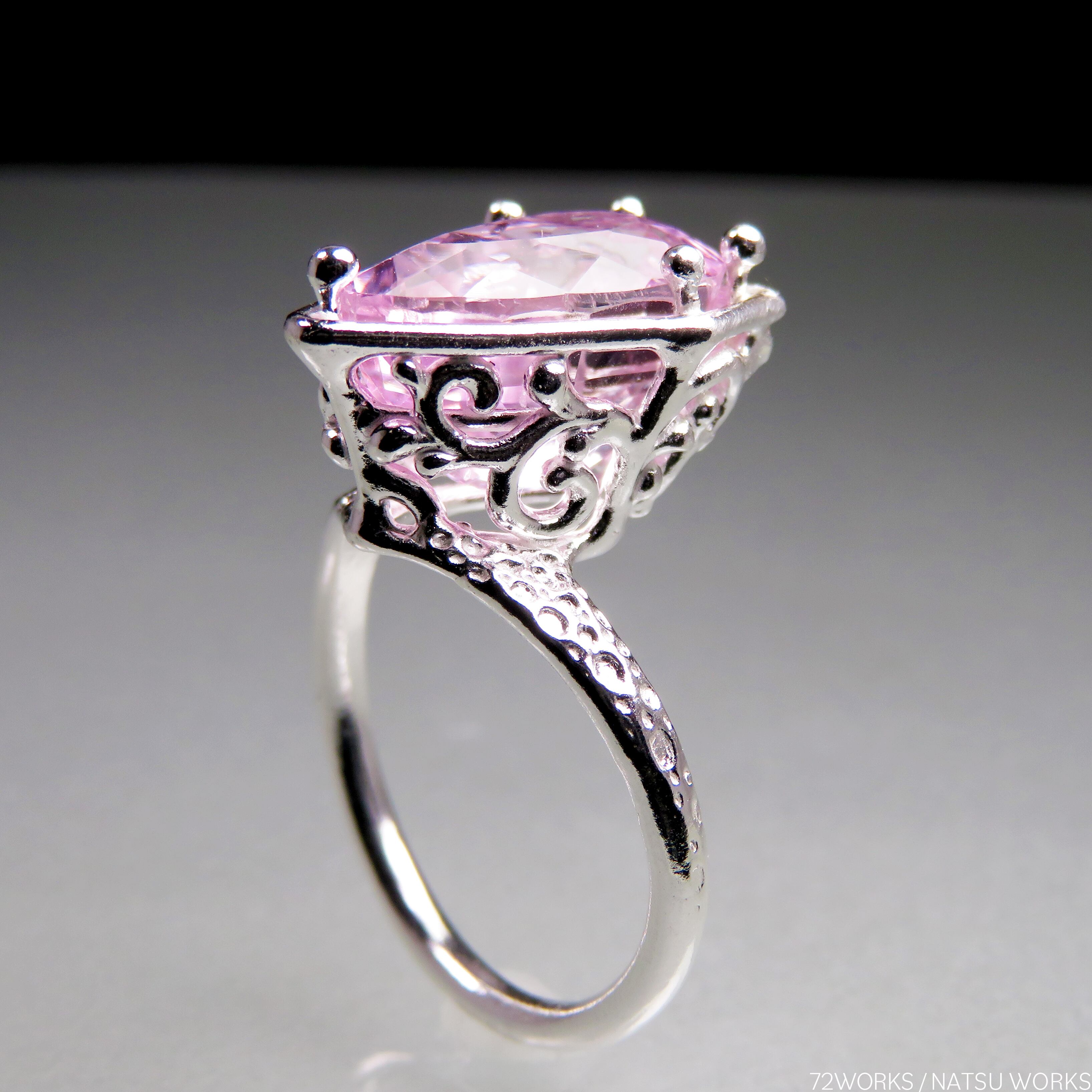 ボリュームがあり優しいピンクが輝く石を、透かし模様の台座にセットしました。