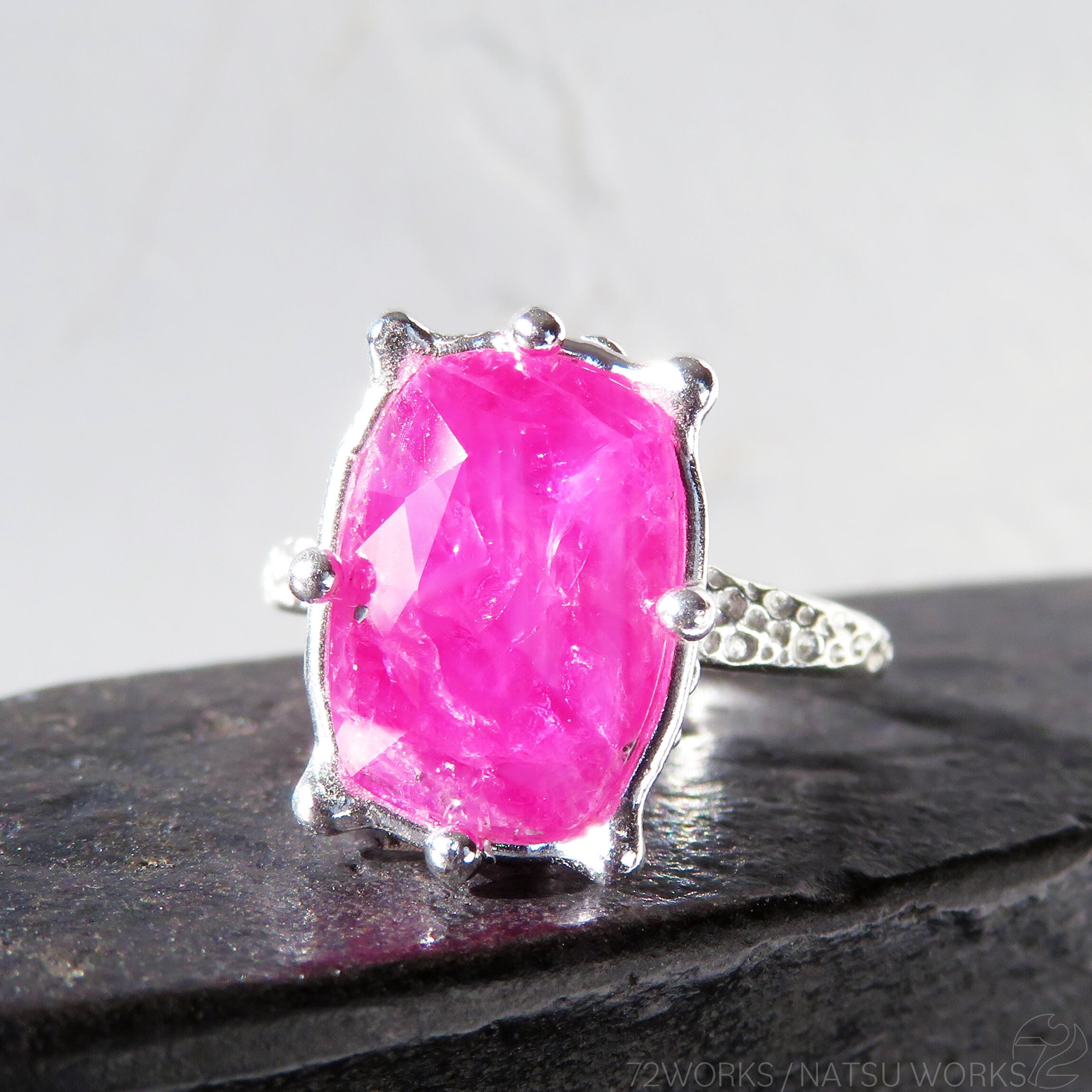 ビビットなピンクが輝く石を、唐草と透かし模様の台座にセットしました。