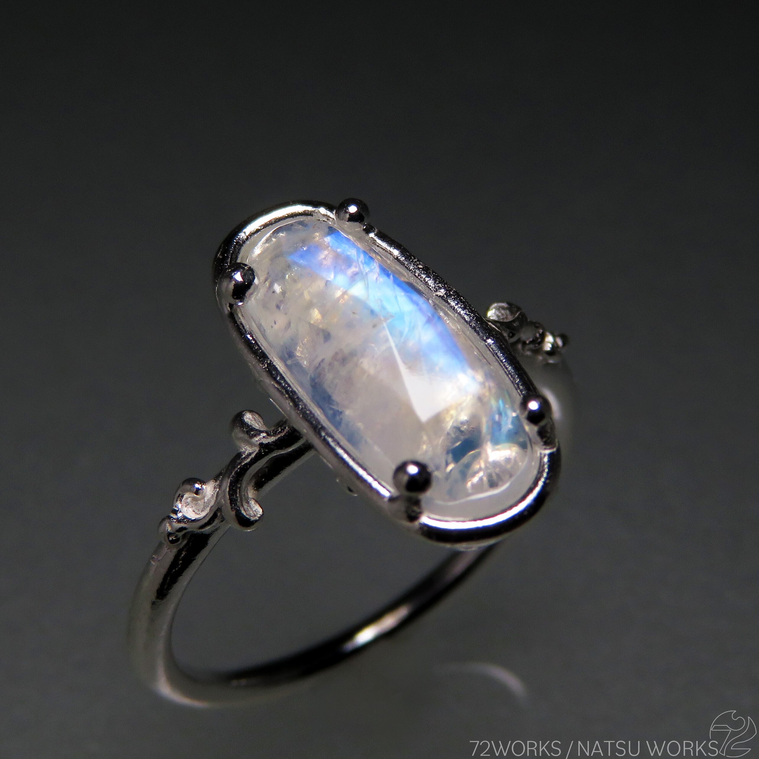 ブルーに輝く小さなムーンストーンを、唐草の細身のアームにセットしました。