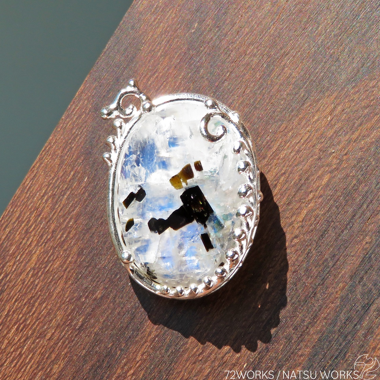 ボタニカルなイメージの縁取りと、黒いトルマリンを内包したレインボームーンストーンのブローチ。