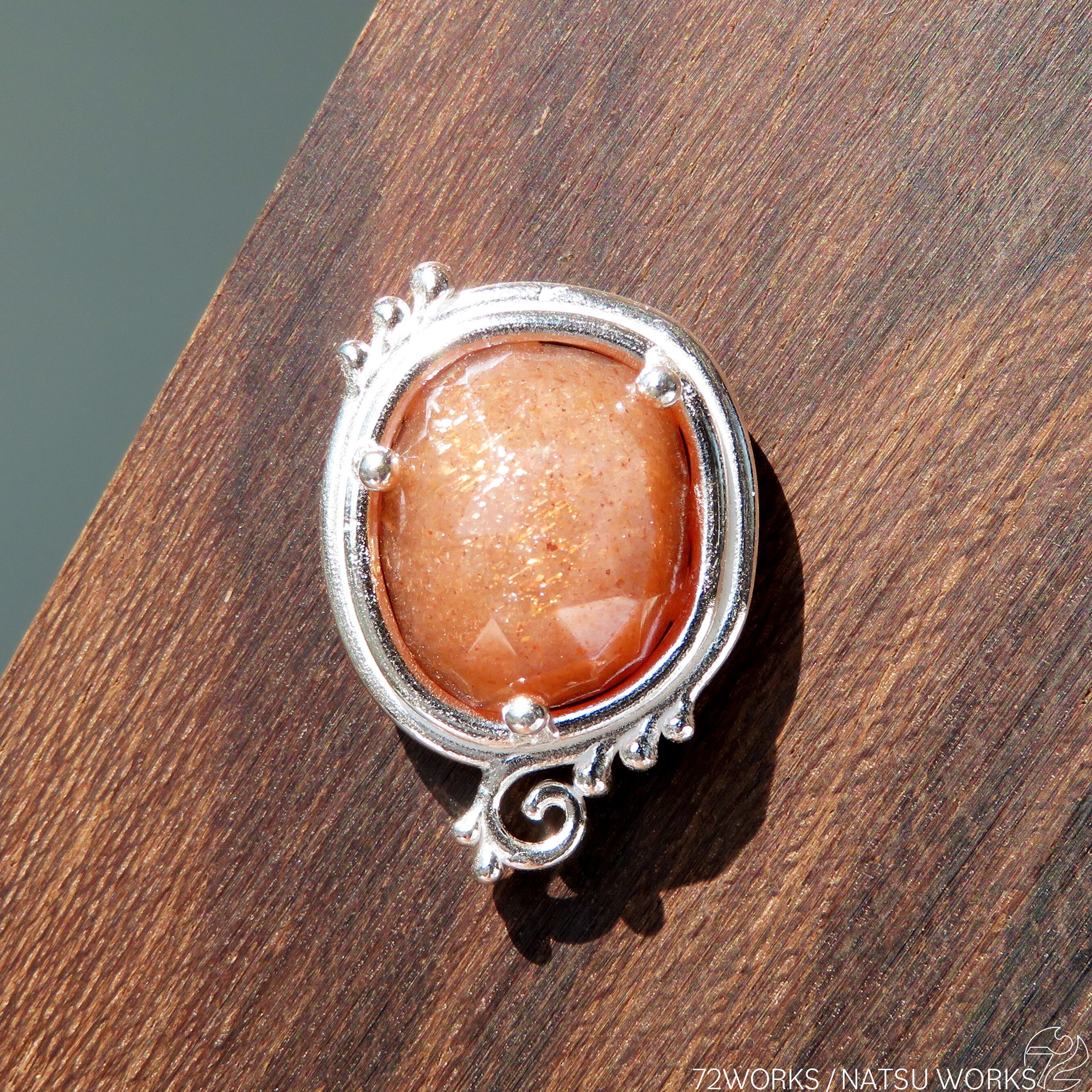 ボタニカルなイメージの縁取りに、ラメ状に輝くサンストーンをセットしたブローチ。