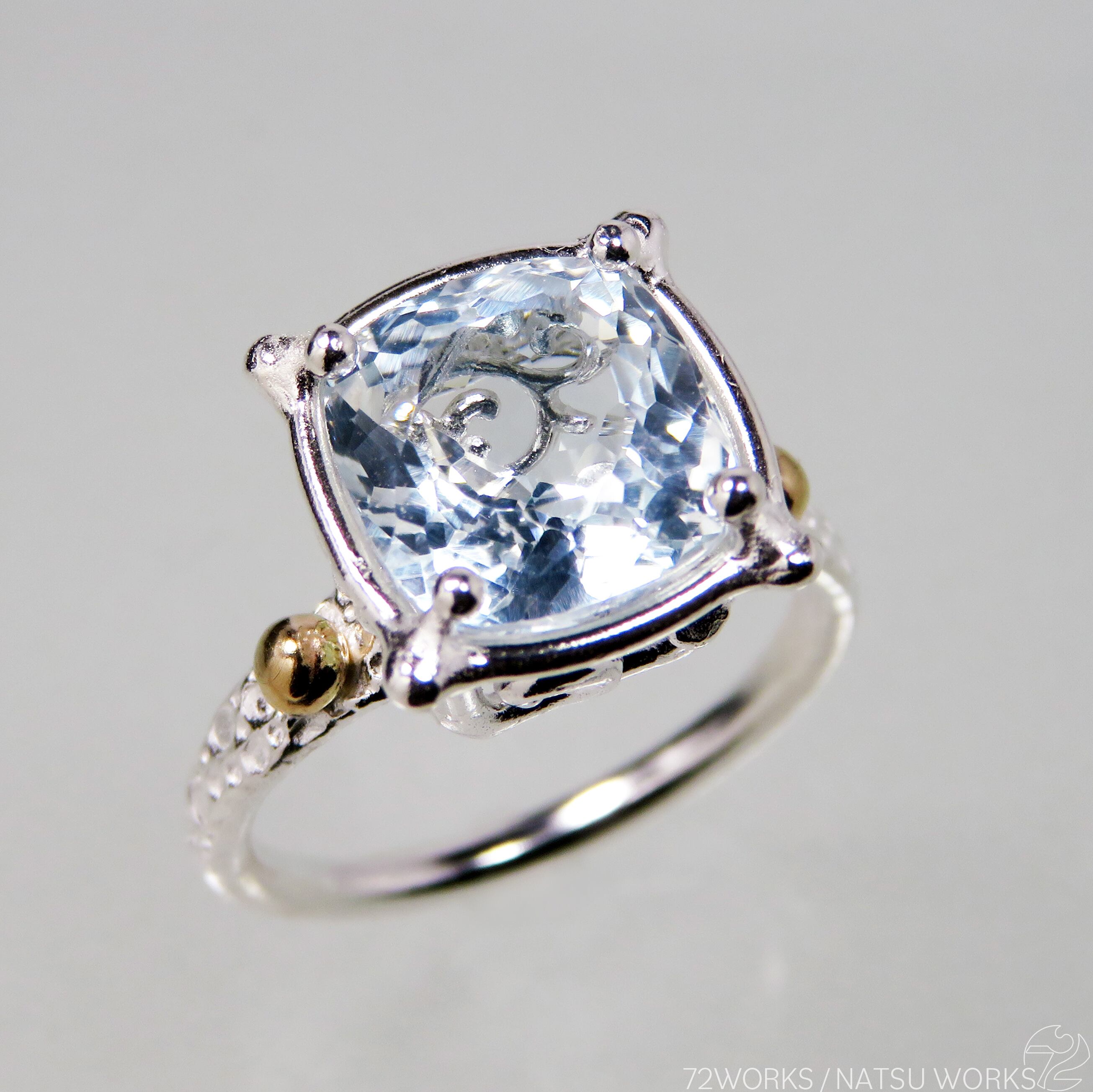 爽やかなブルーのトパーズを、18金で飾った唐草と透かし模様の台座にセットしました。