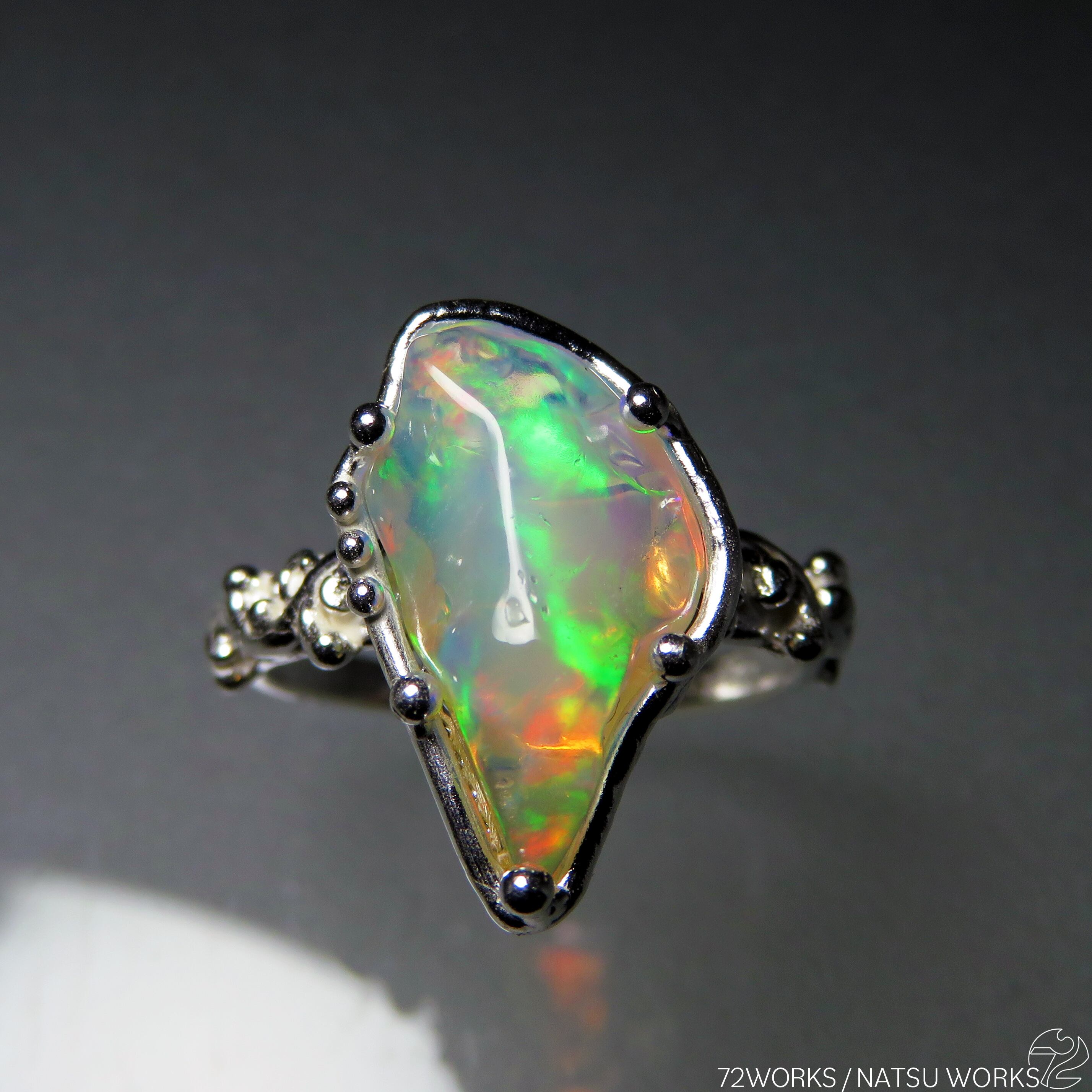 原石の魅力を残して磨かれたエチオピアオパールを使用したリング。