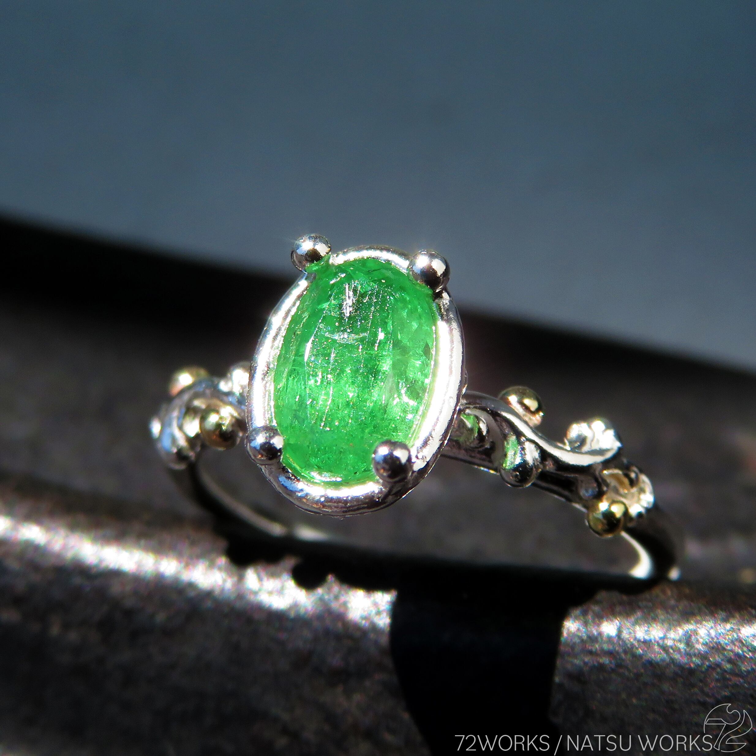 ツァボライト特有の鮮やかなグリーンを、18金で飾った唐草と透かし模様の台座にセットしました。