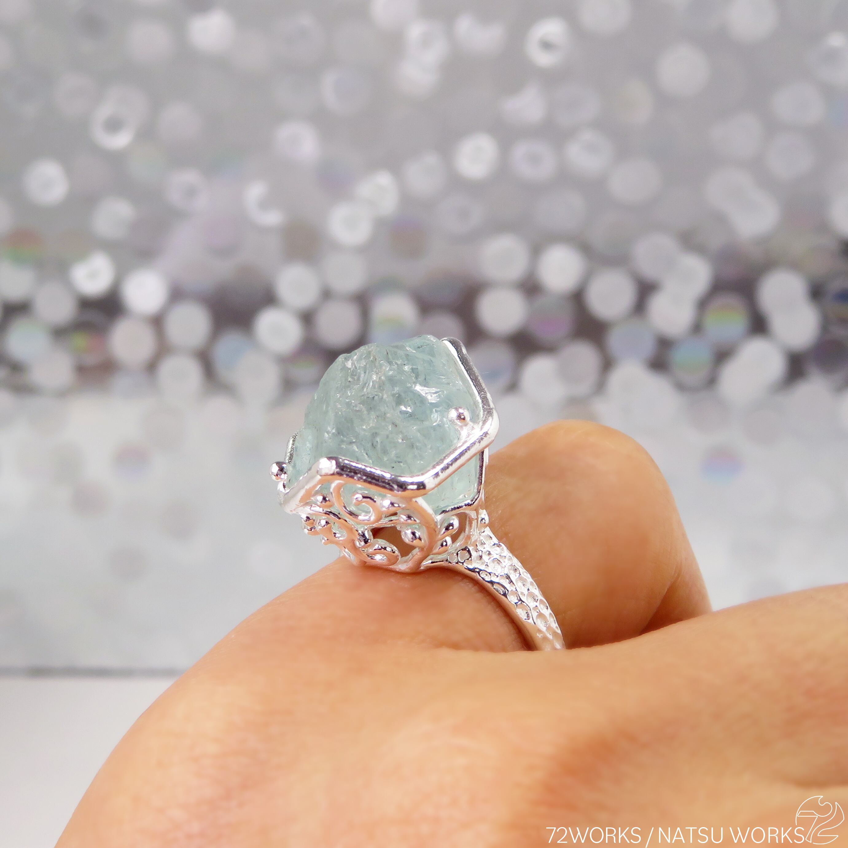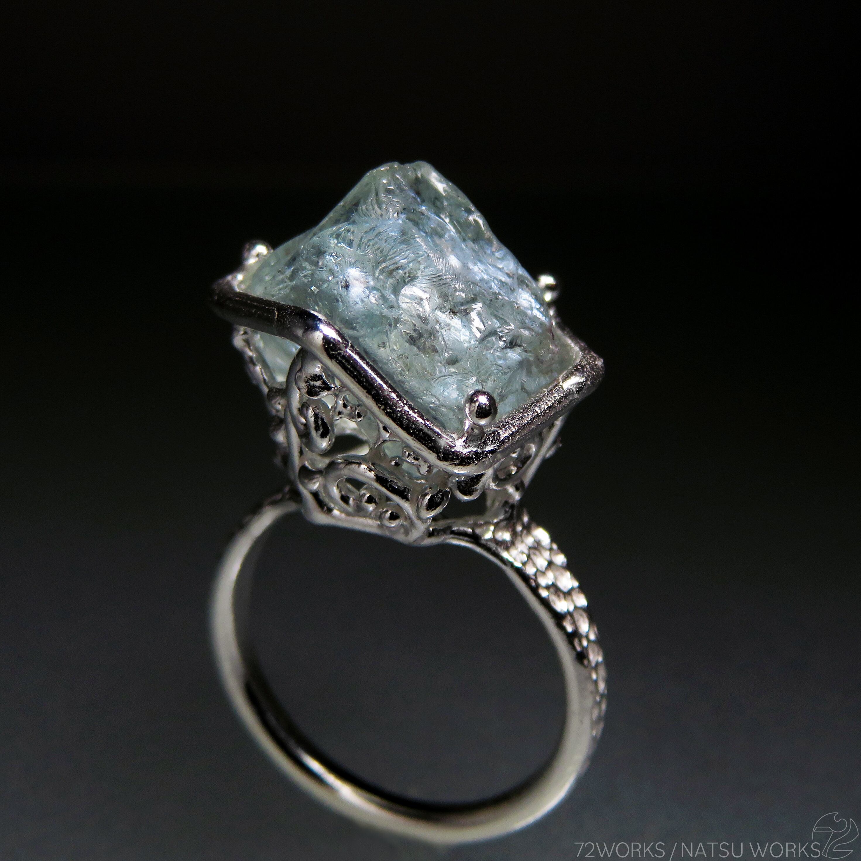 落ち着いた青の中にシラーの様な輝きが見える原石を、そのまま唐草と透かし模様の台座にセットしました。
