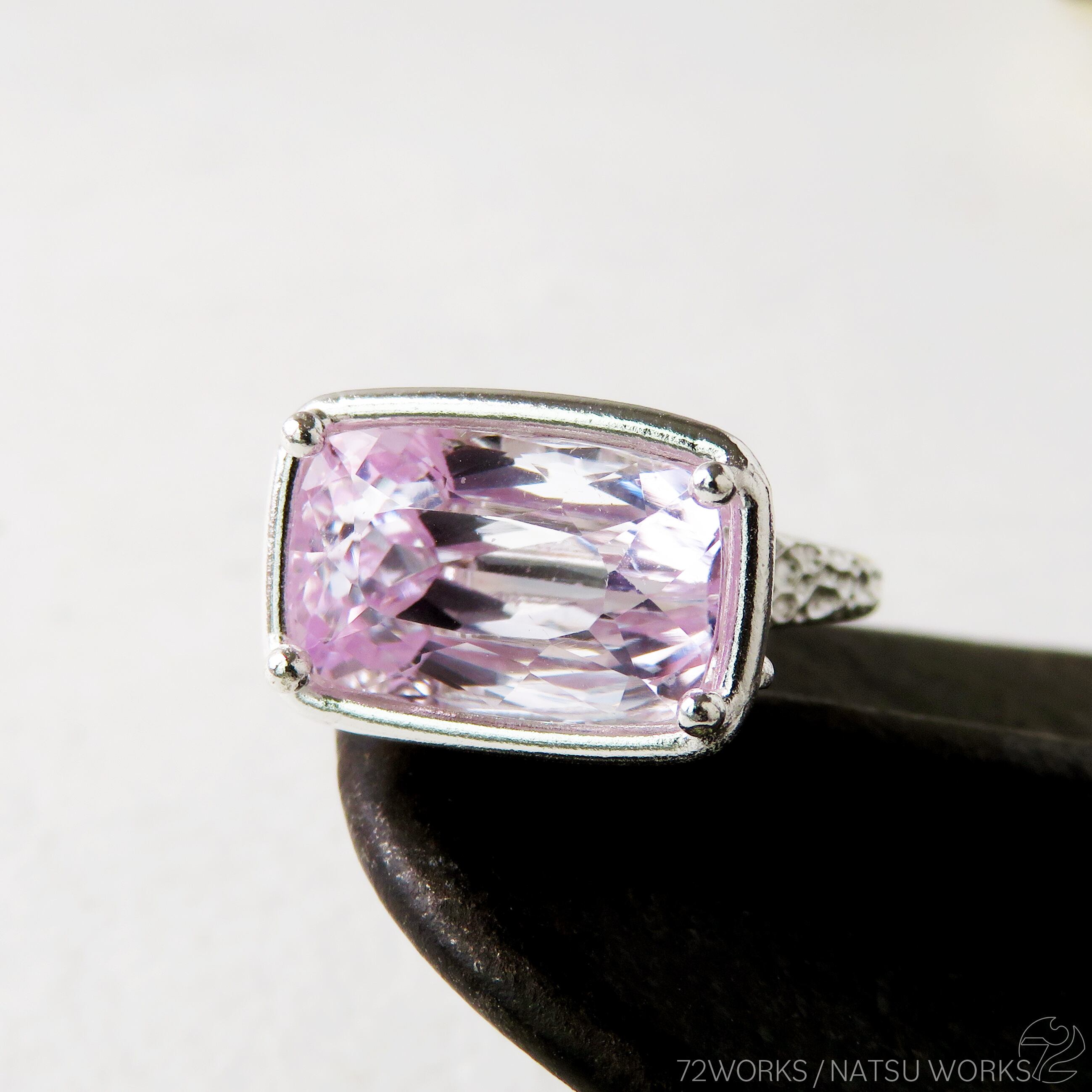 ボリュームがあり優しいピンクに輝く石を、唐草と透かし模様の台座にセットしました。