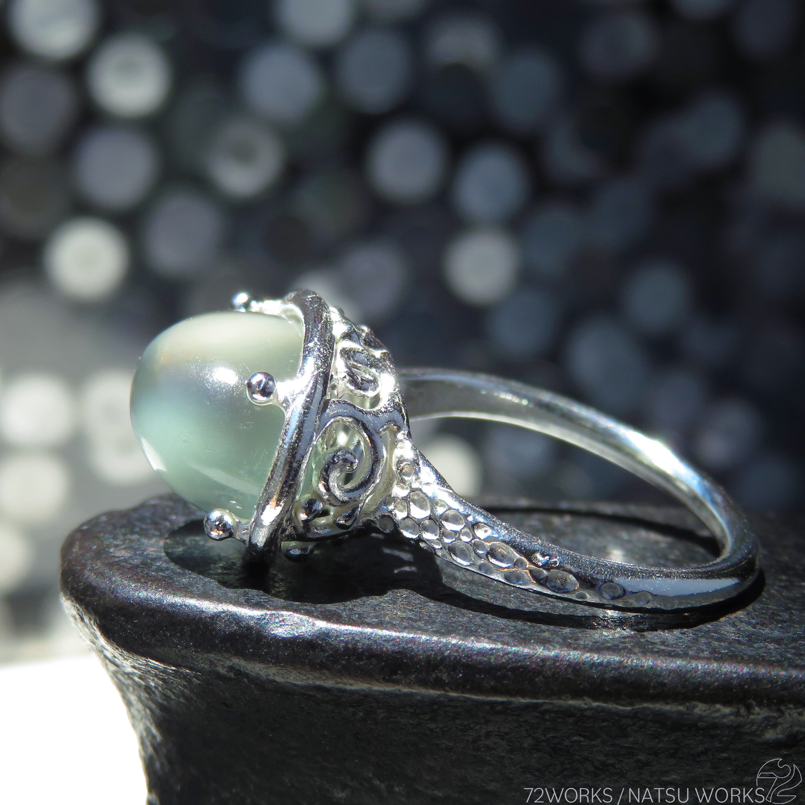 たくさんの光を取り込み帯状に輝くムーンストーンを、唐草と透かし模様の台座にセットしました。