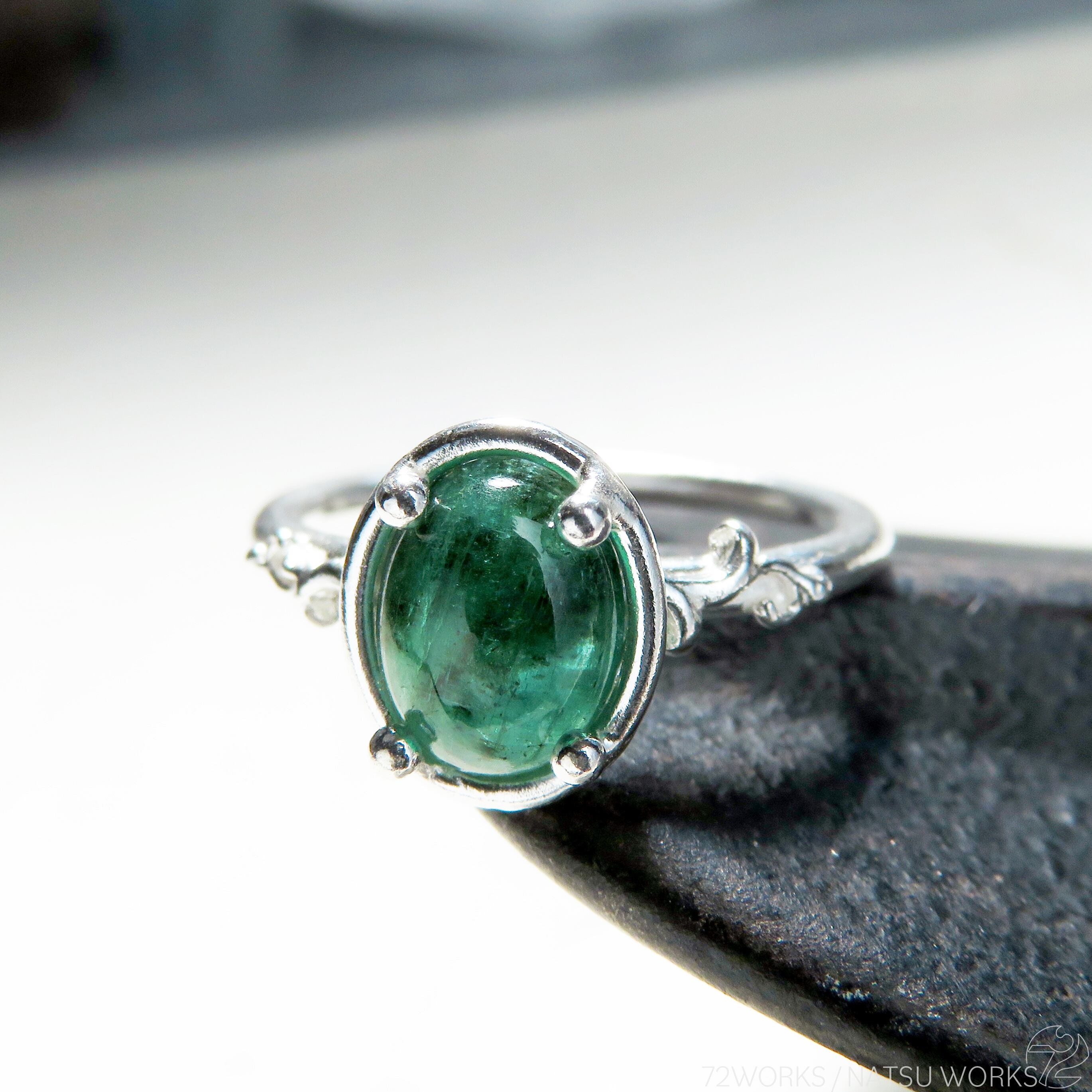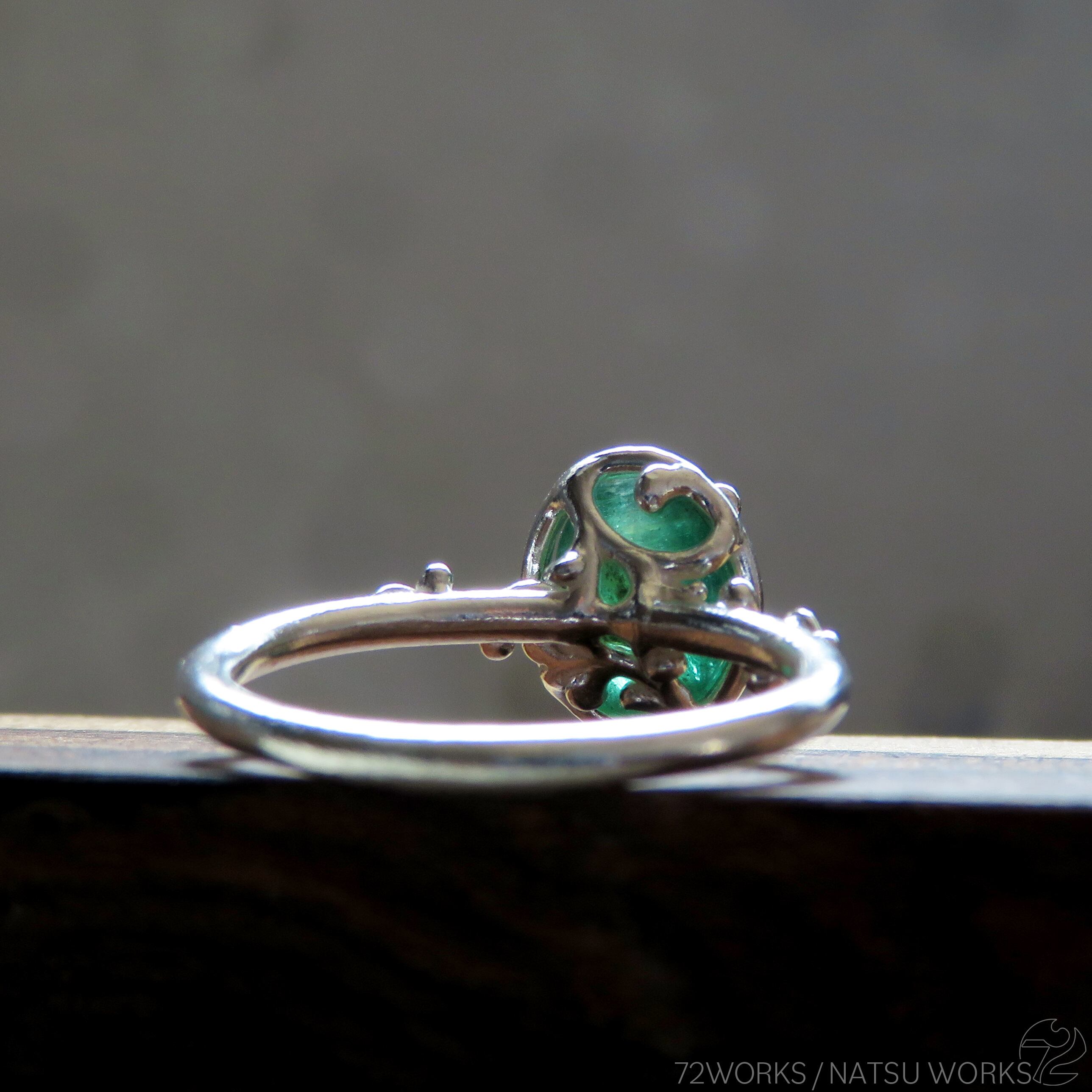 おちついたグリーンのザンビア産エメラルドを、唐草と透かし模様の細身のリングにセットしました。