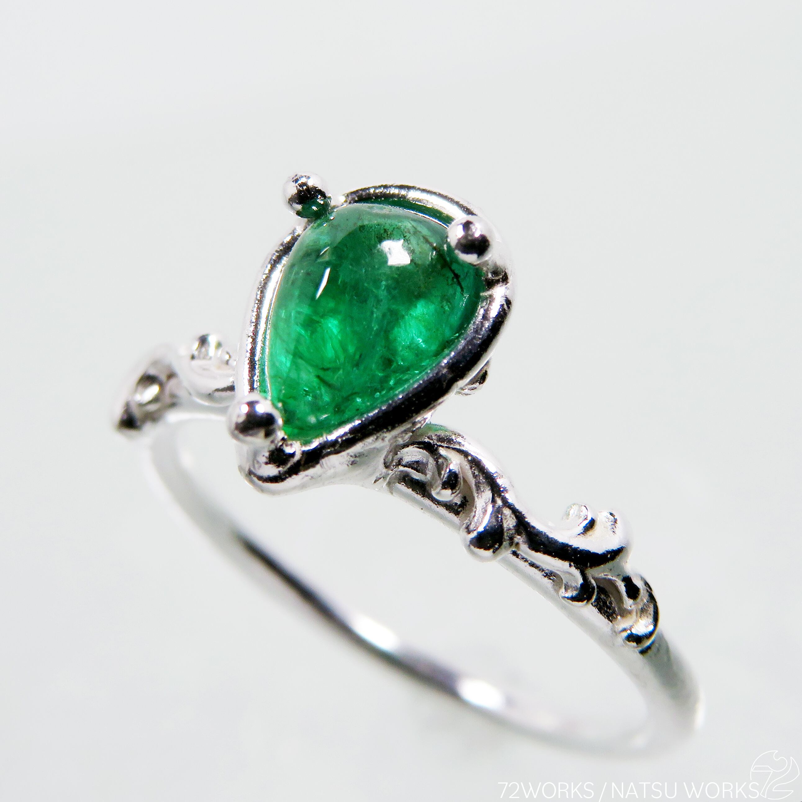 おちついたグリーンのザンビア産エメラルドを、唐草と透かし模様の細身のリングにセットしました。