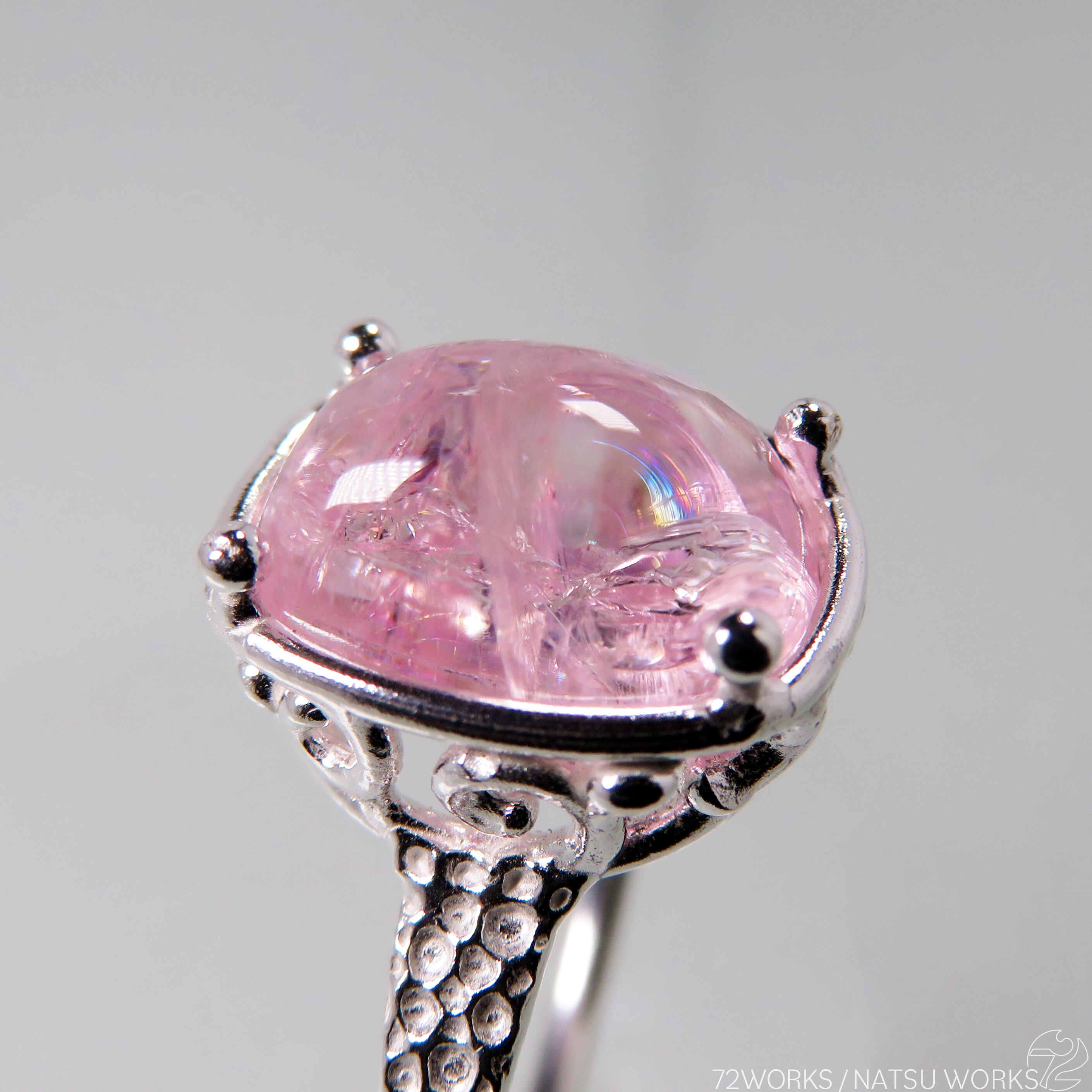 優しいピンクの中に虹色が輝くモルガナイトを、唐草と透かし模様の台座にセットしました。
