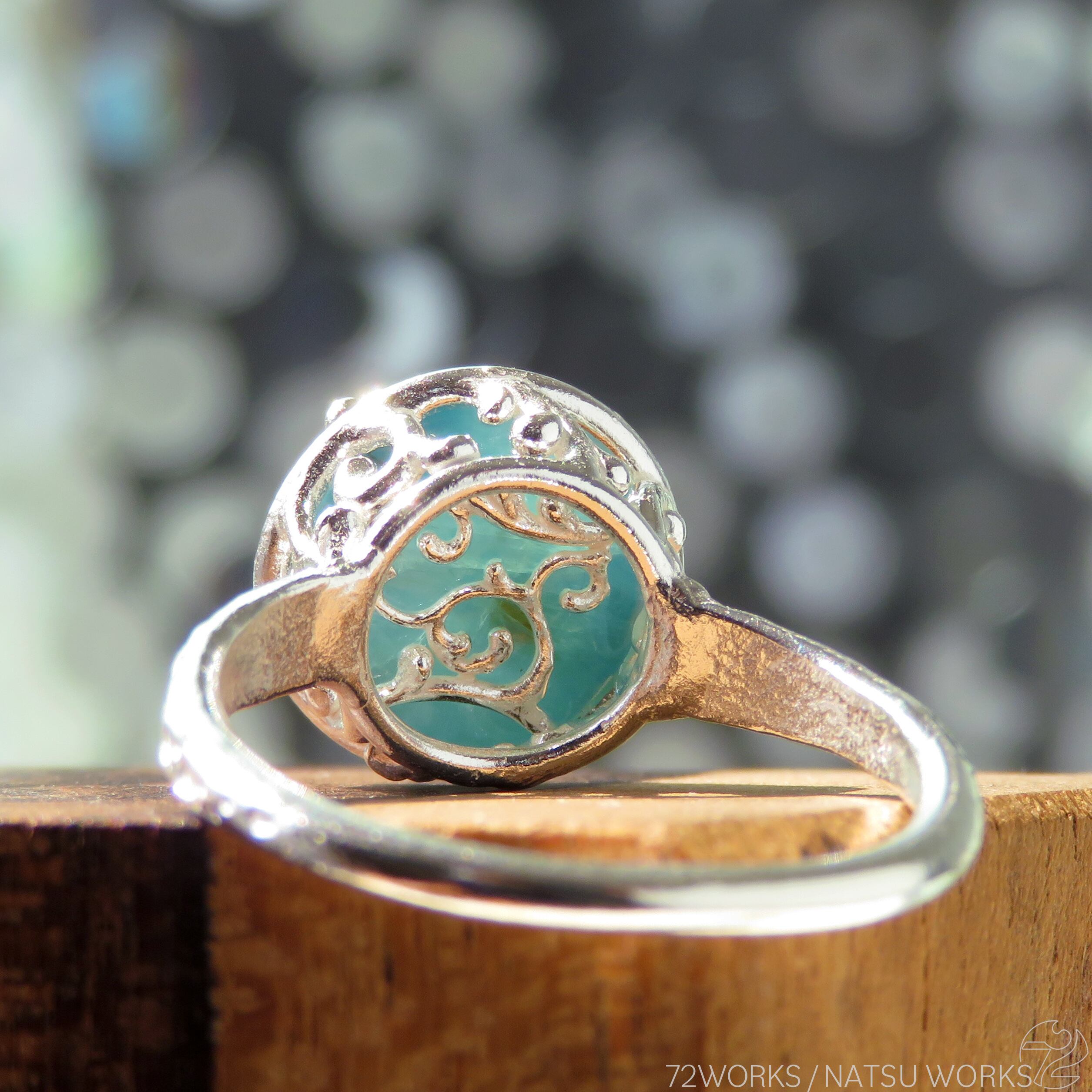 おちついたグリーンのグランディディエライトを、唐草と透かし模様の台座にセットしました。