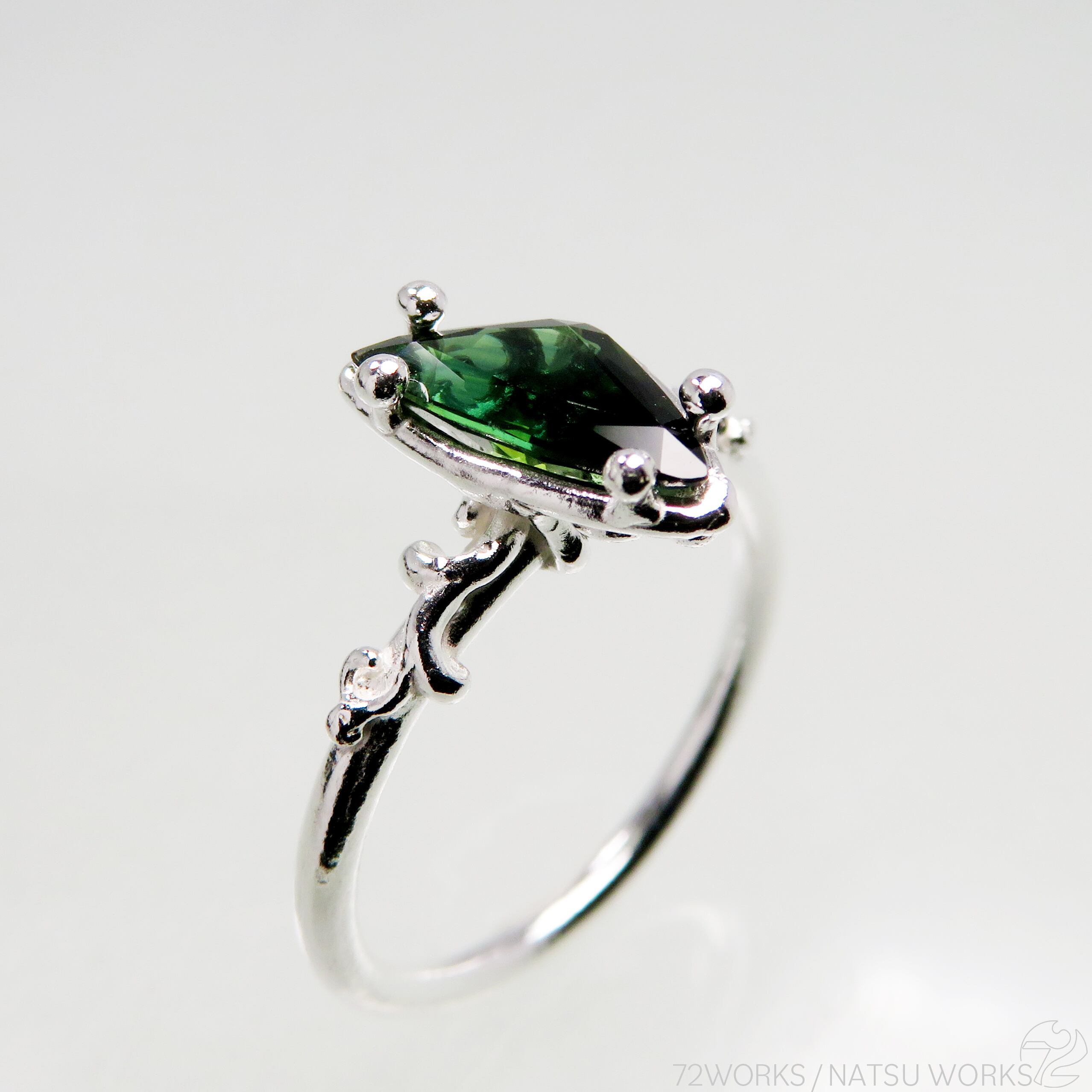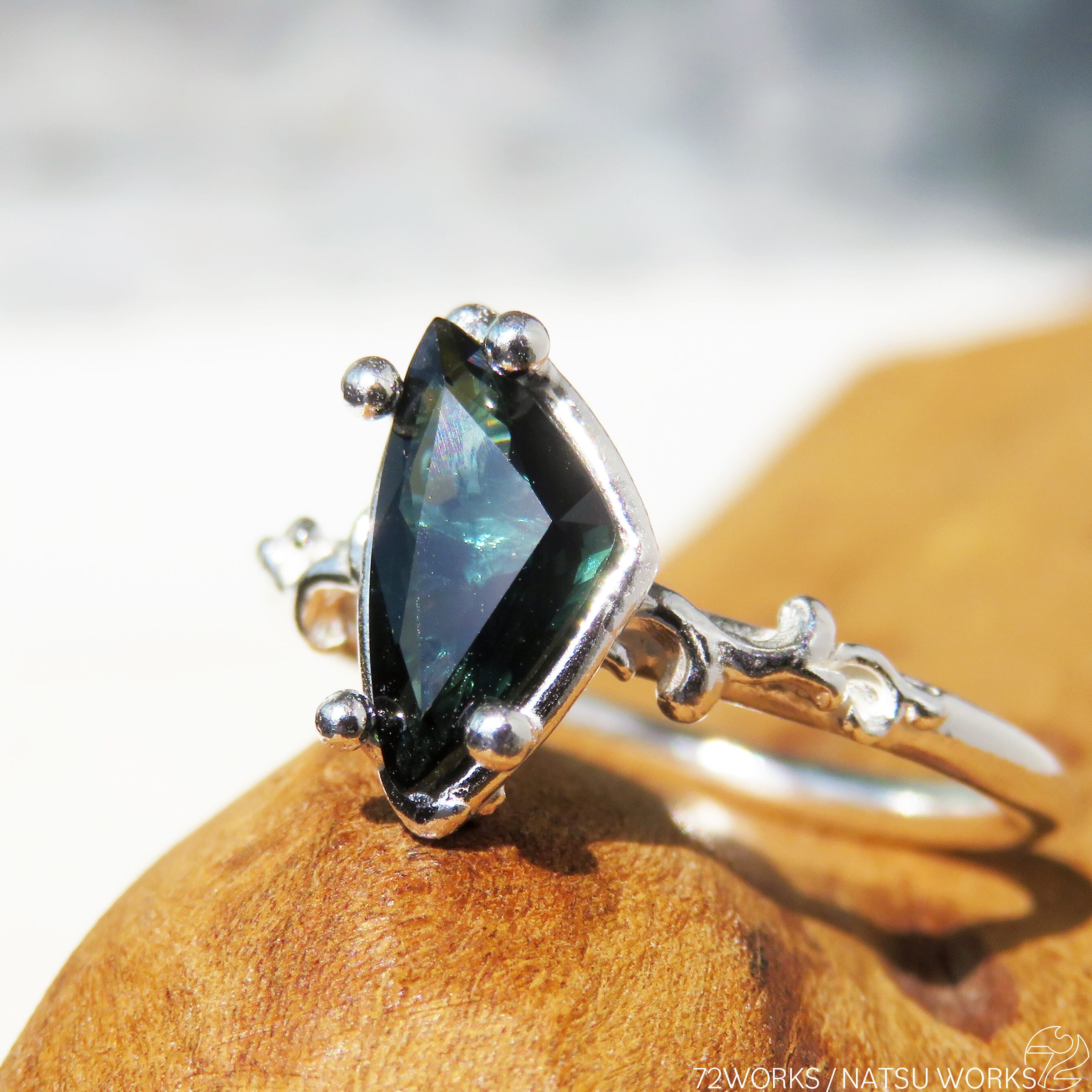 ブルーとグリーンの優しいグラデーションを持つサファイアを、唐草と透かし模様の細身のリングにセットしました。