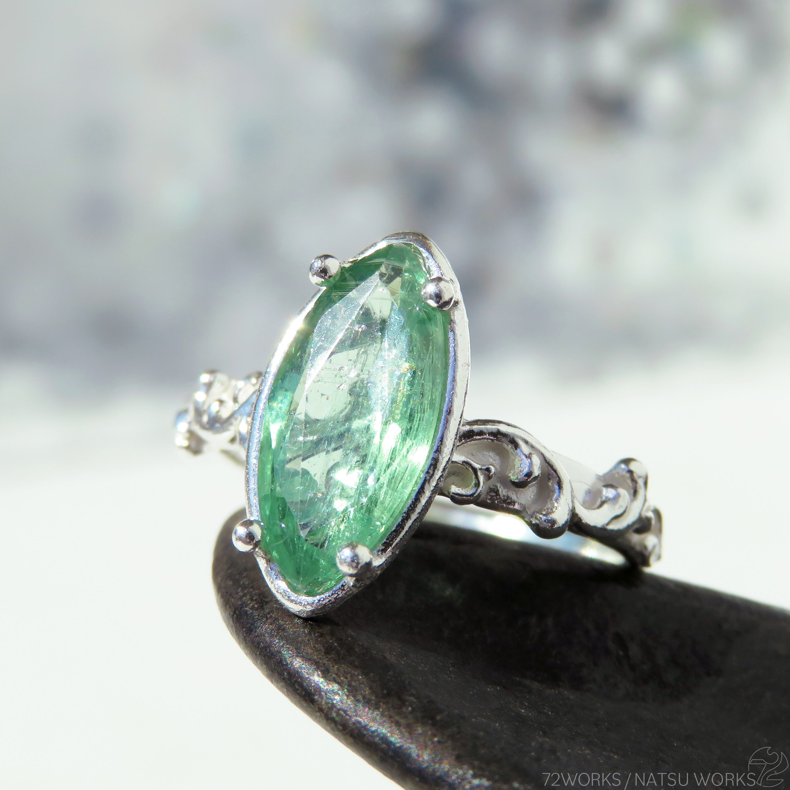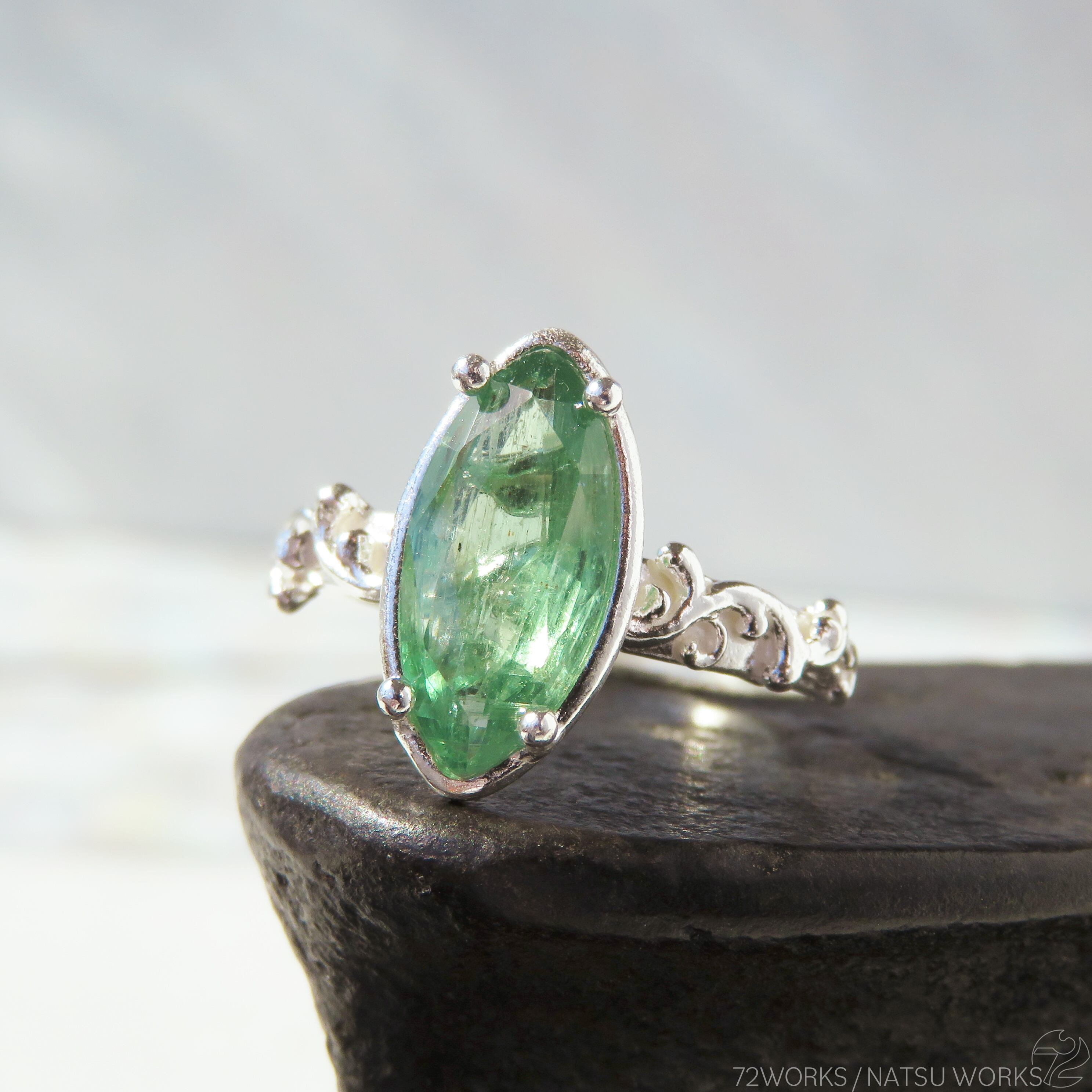 鮮やかなグリーンが映えるカイヤナイトを、唐草と透かし模様の細身のリングにセットしました。