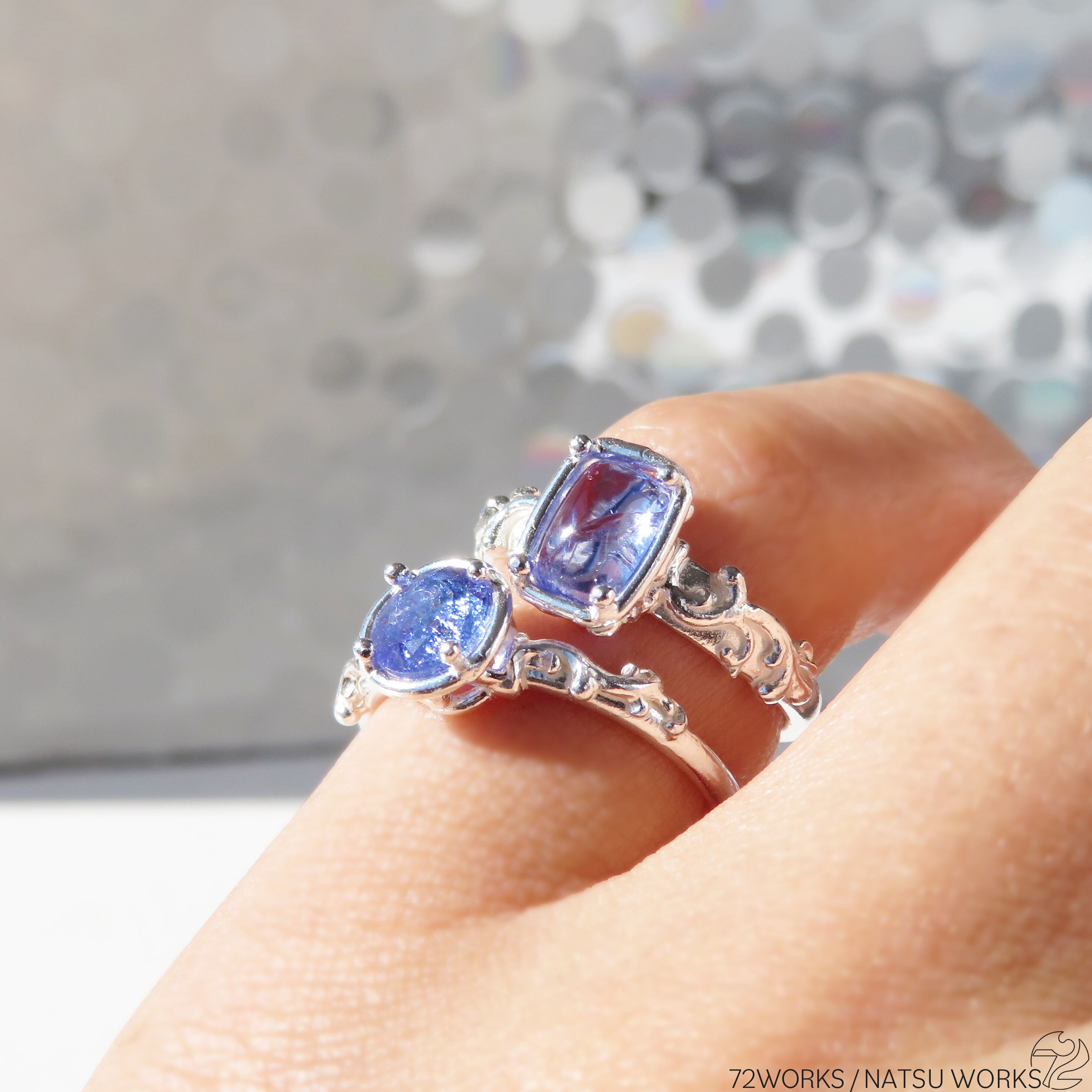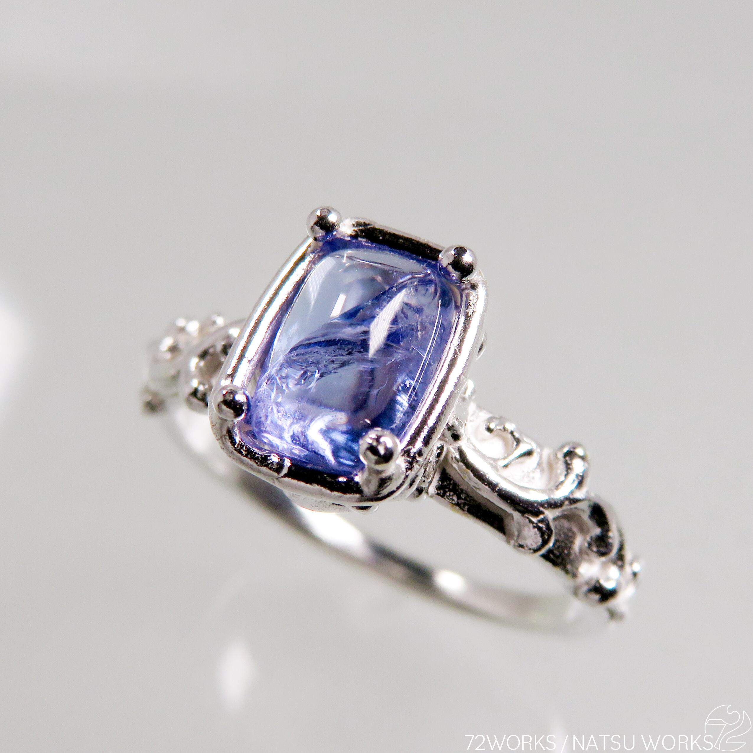 深みのあるブルーが映える石を、ボタニカルな細身のリングにセットしました。