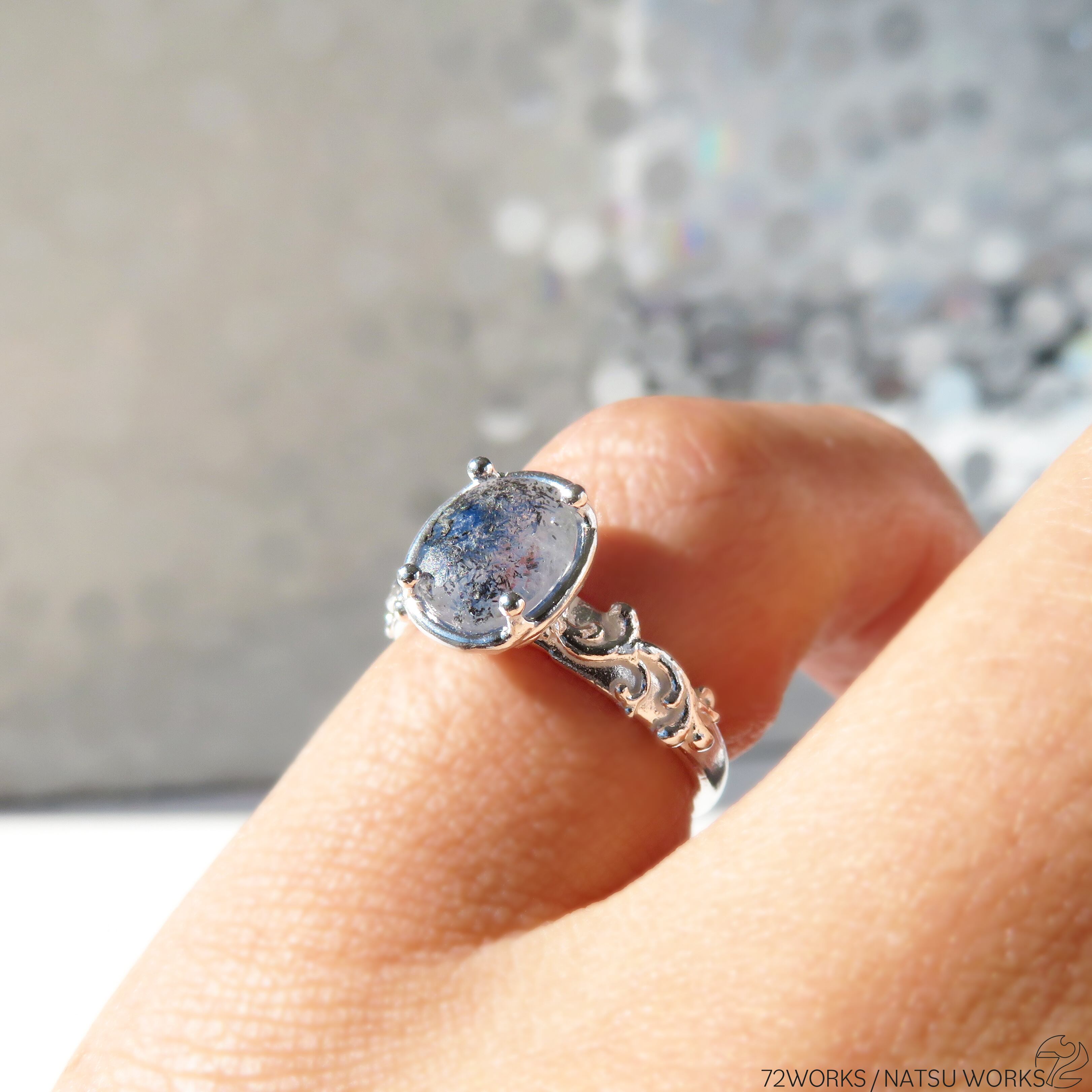 特有のブルーを内包したシルキーな水晶を、唐草と透かし模様の細身のリングにセットしました。