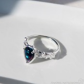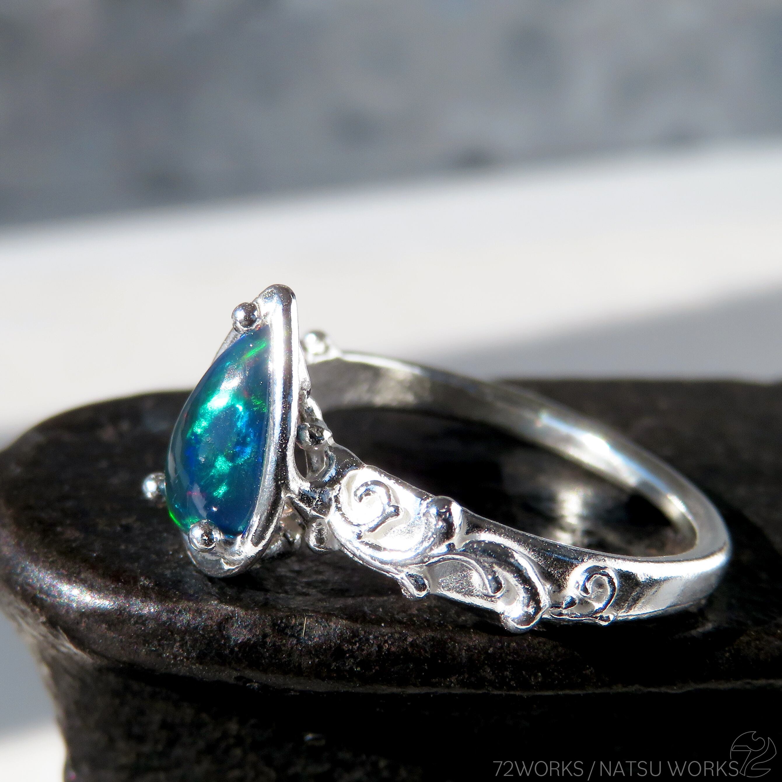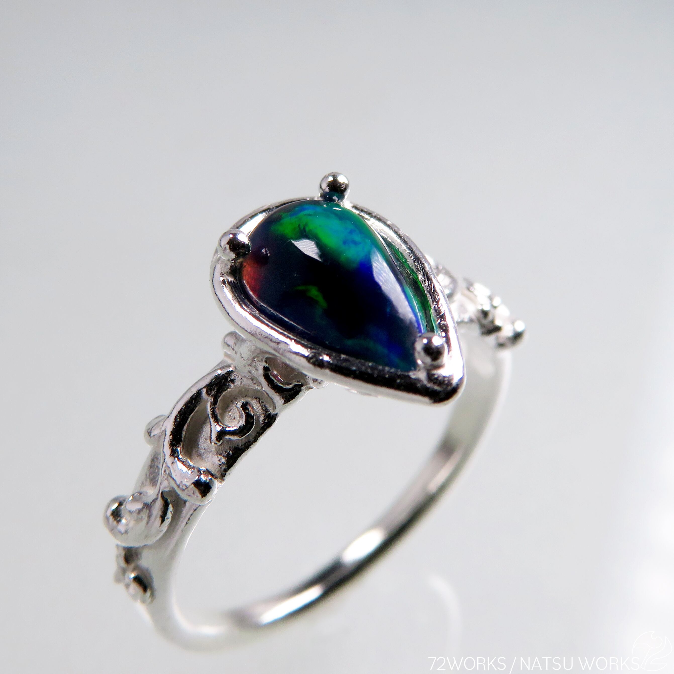 ダークカラーにカラフルな遊色が映えるオパールを、ボタニカルな細身のリングにセットしました。