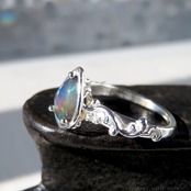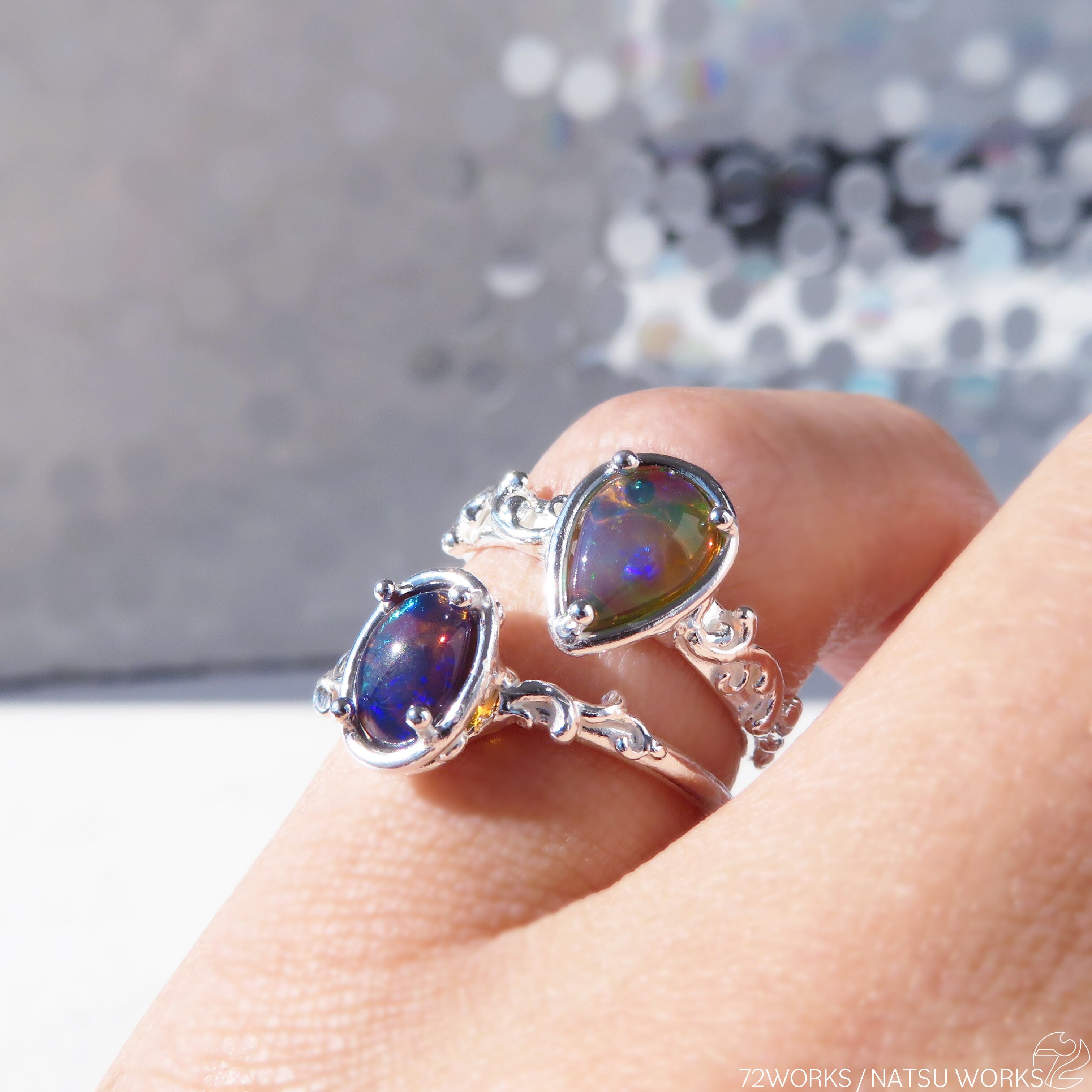 ダークカラーにカラフルな遊色が映えるオパールを、ボタニカルな細身のリングにセットしました。