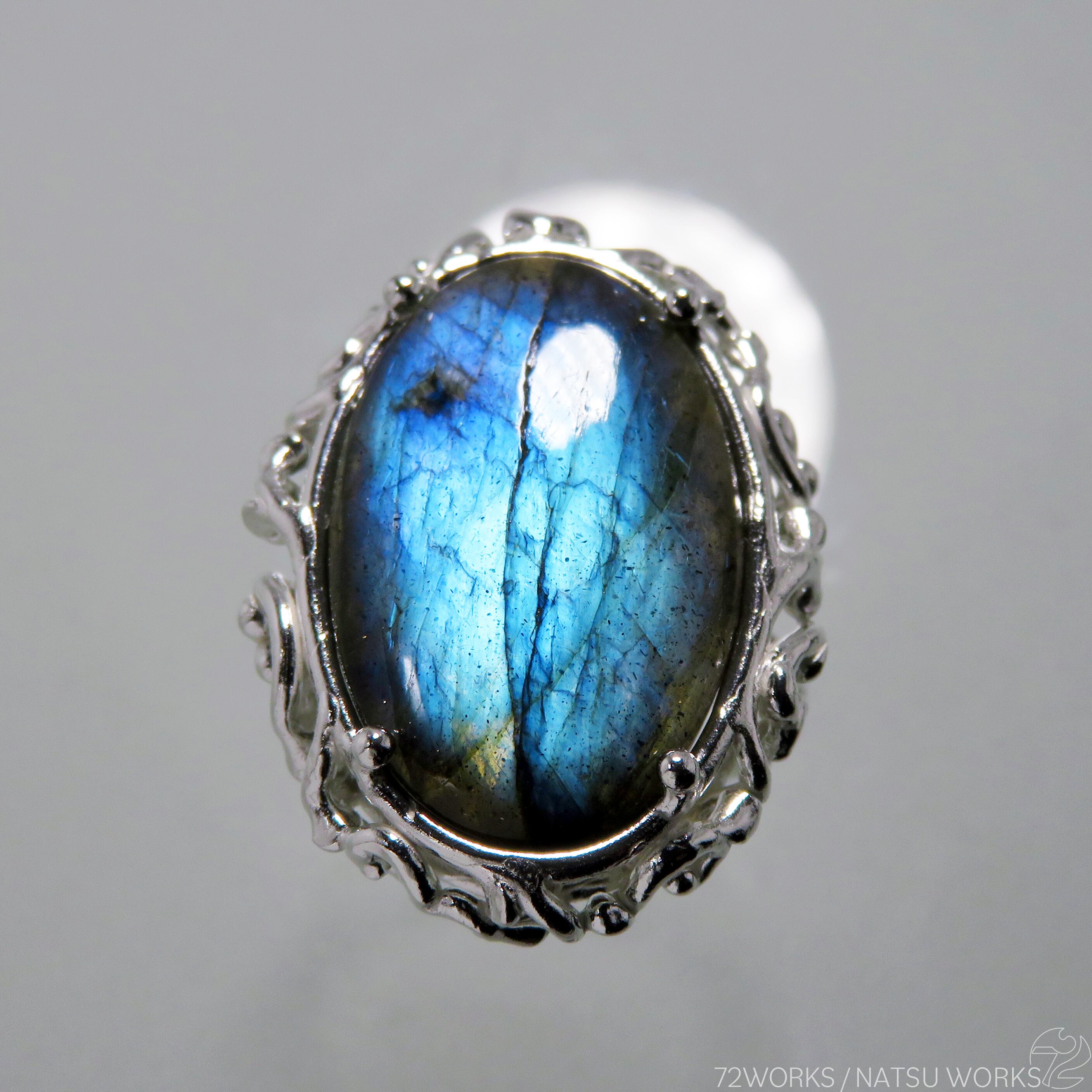 濃いブルーに輝くラブラドライトを、唐草と透かし模様のリングにセットしました。
