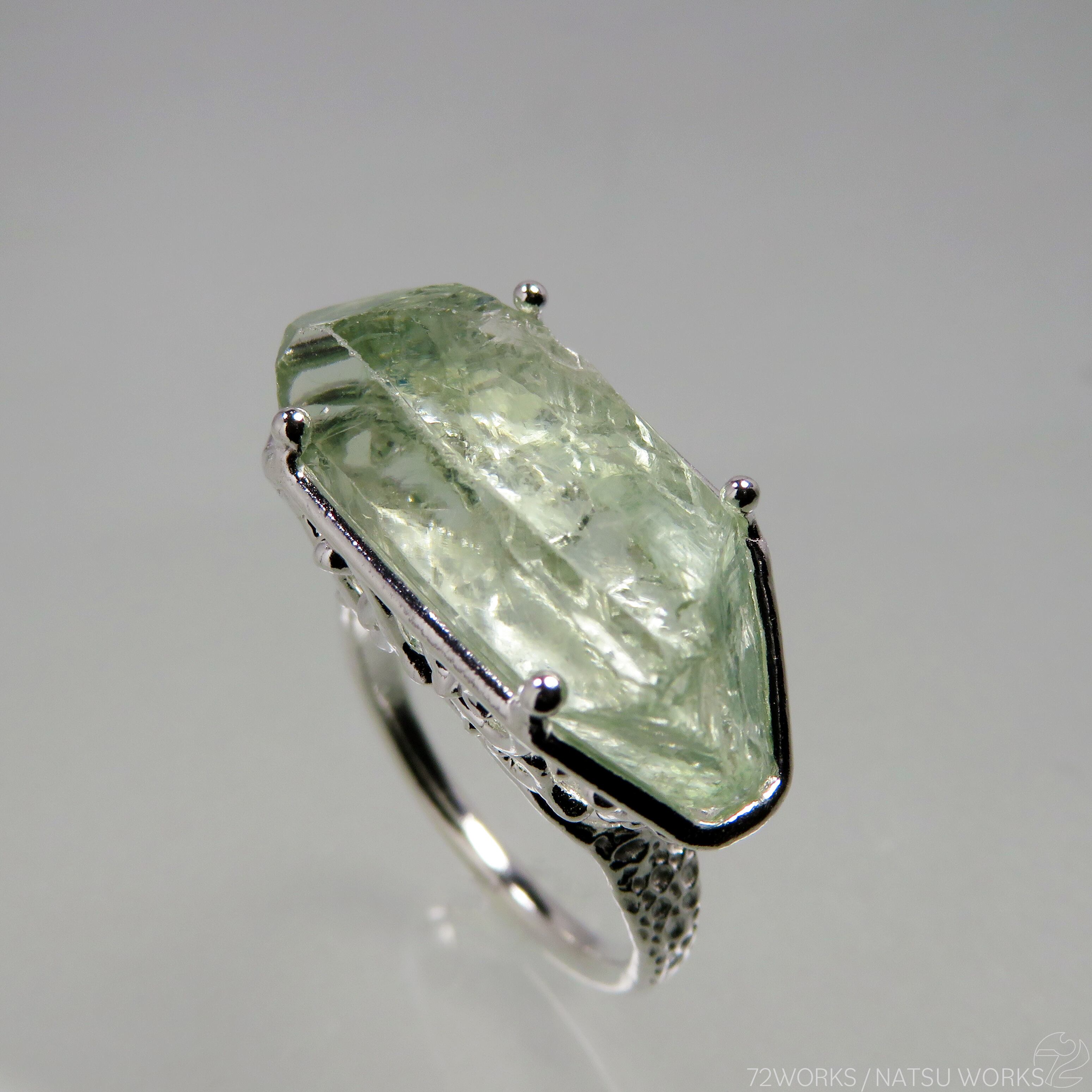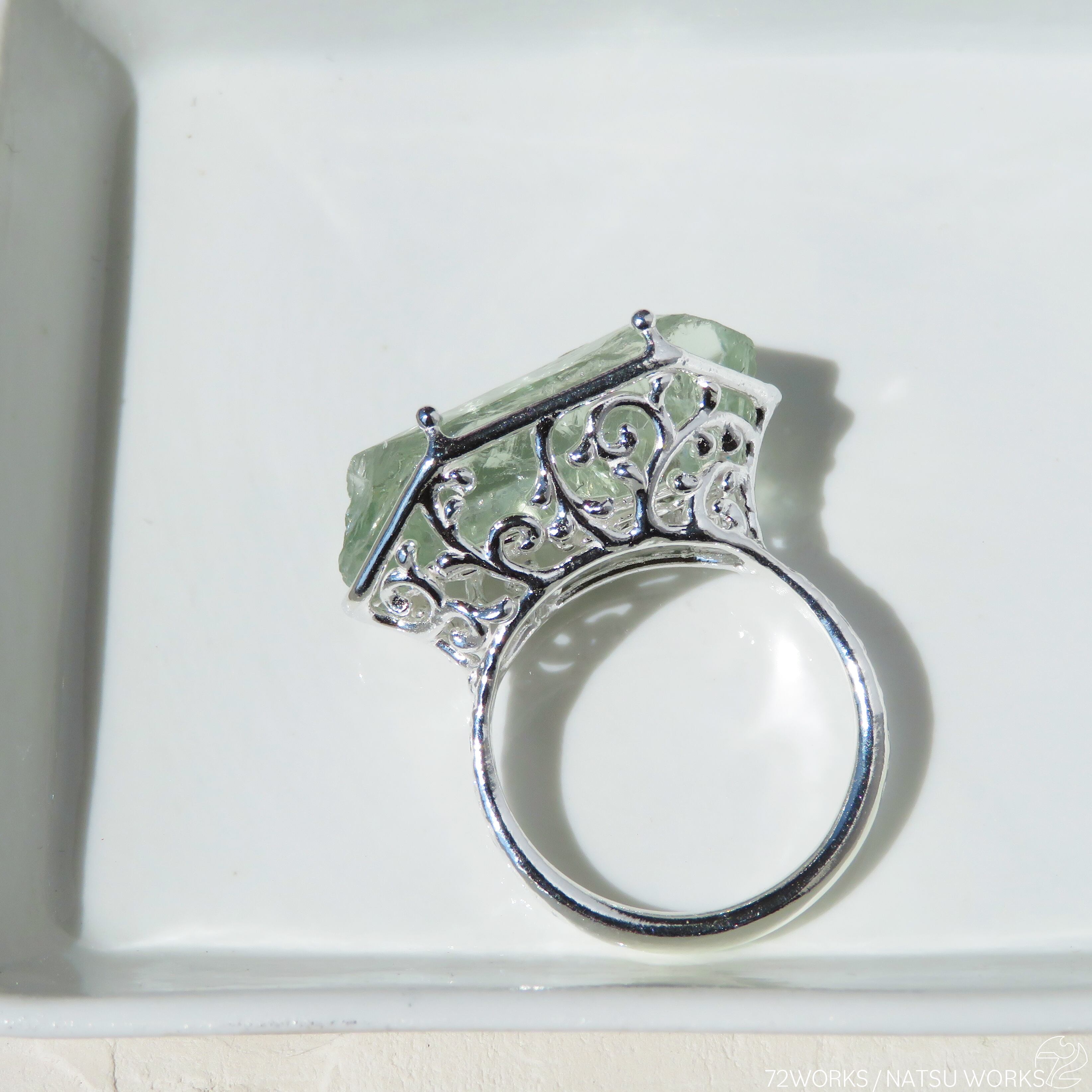 原石ならではの形状と淡いグリーンのアメジストを、透かし模様の台座にセッティングしました。