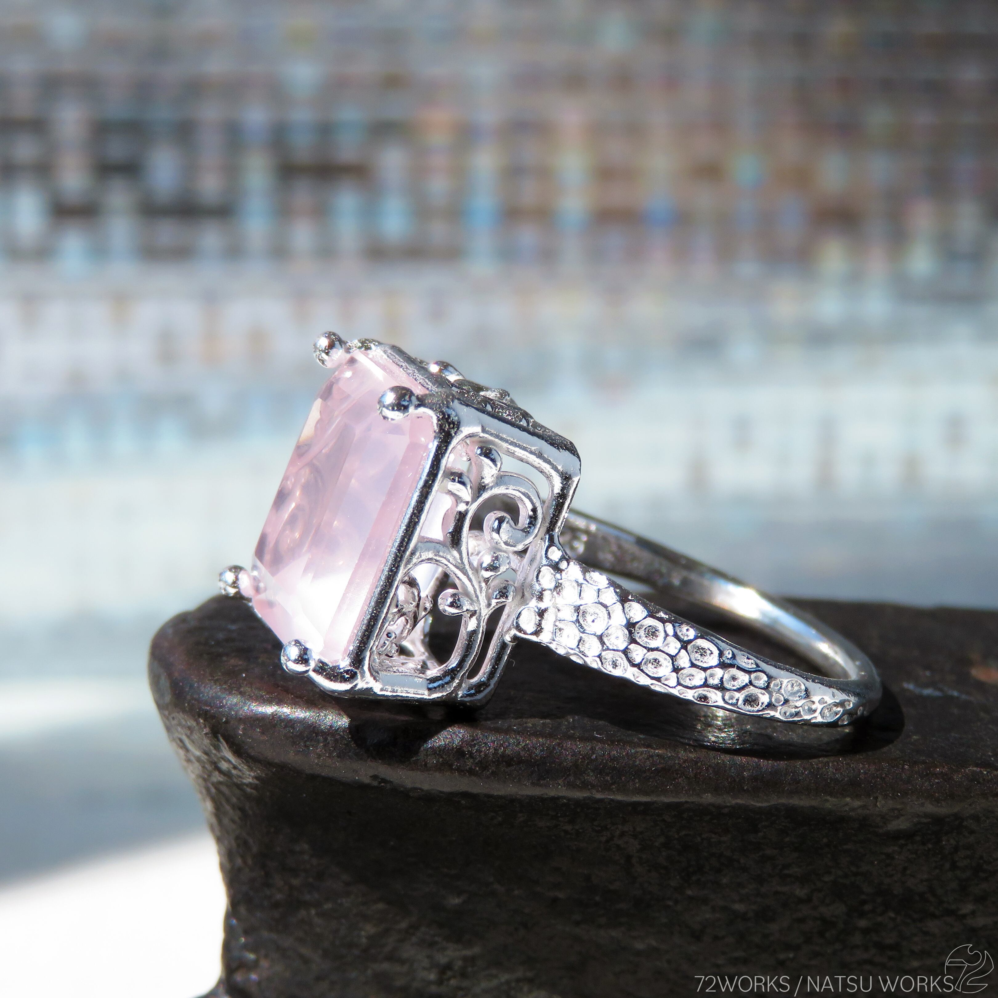 やさしいピンクがスクエアのカットに映えるブラジル産ローズクォーツを、唐草と透かし模様の台座にセットしたリング。
