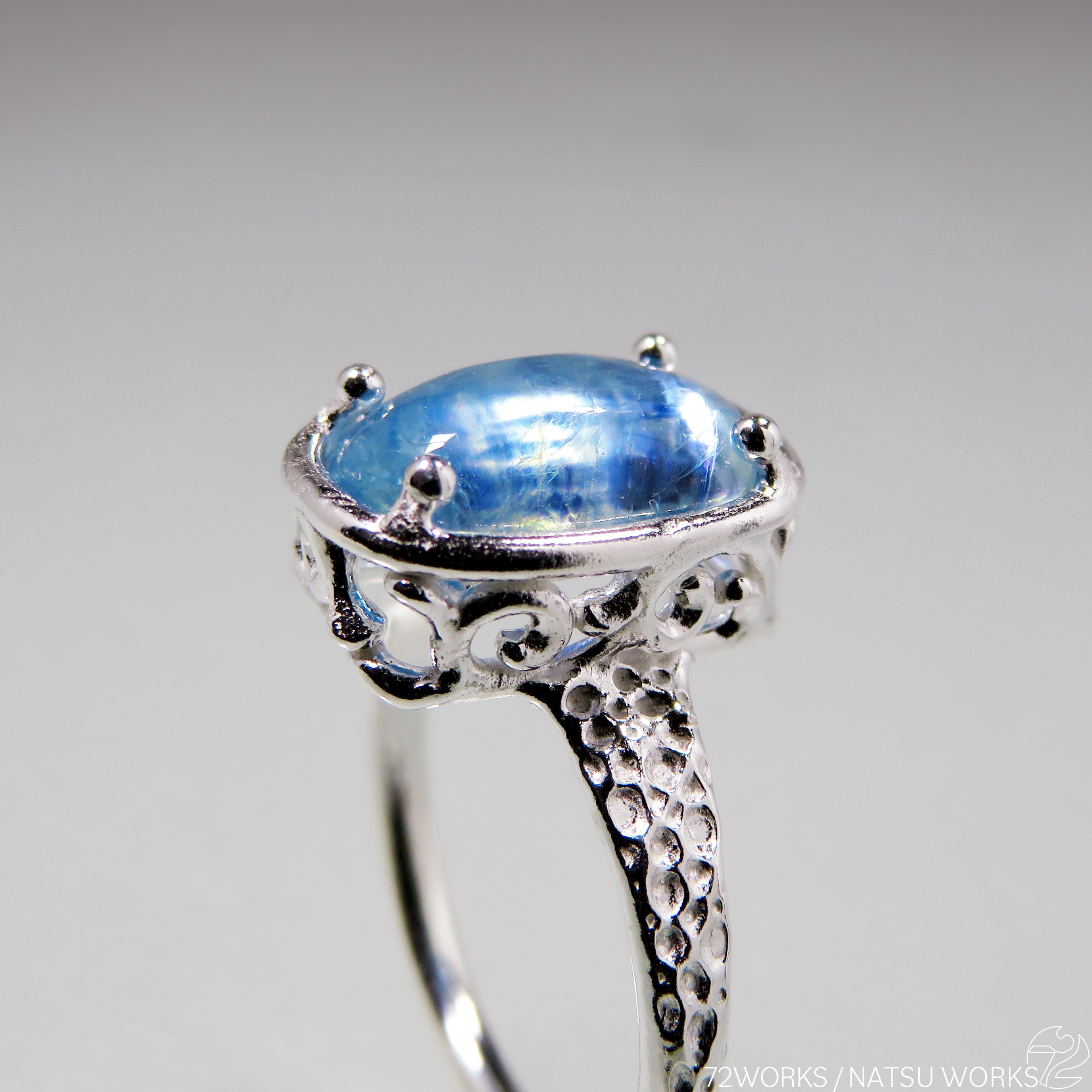 爽やかなブルーのアクアマリンを、唐草と透かし模様の台座にセットしたリング。
