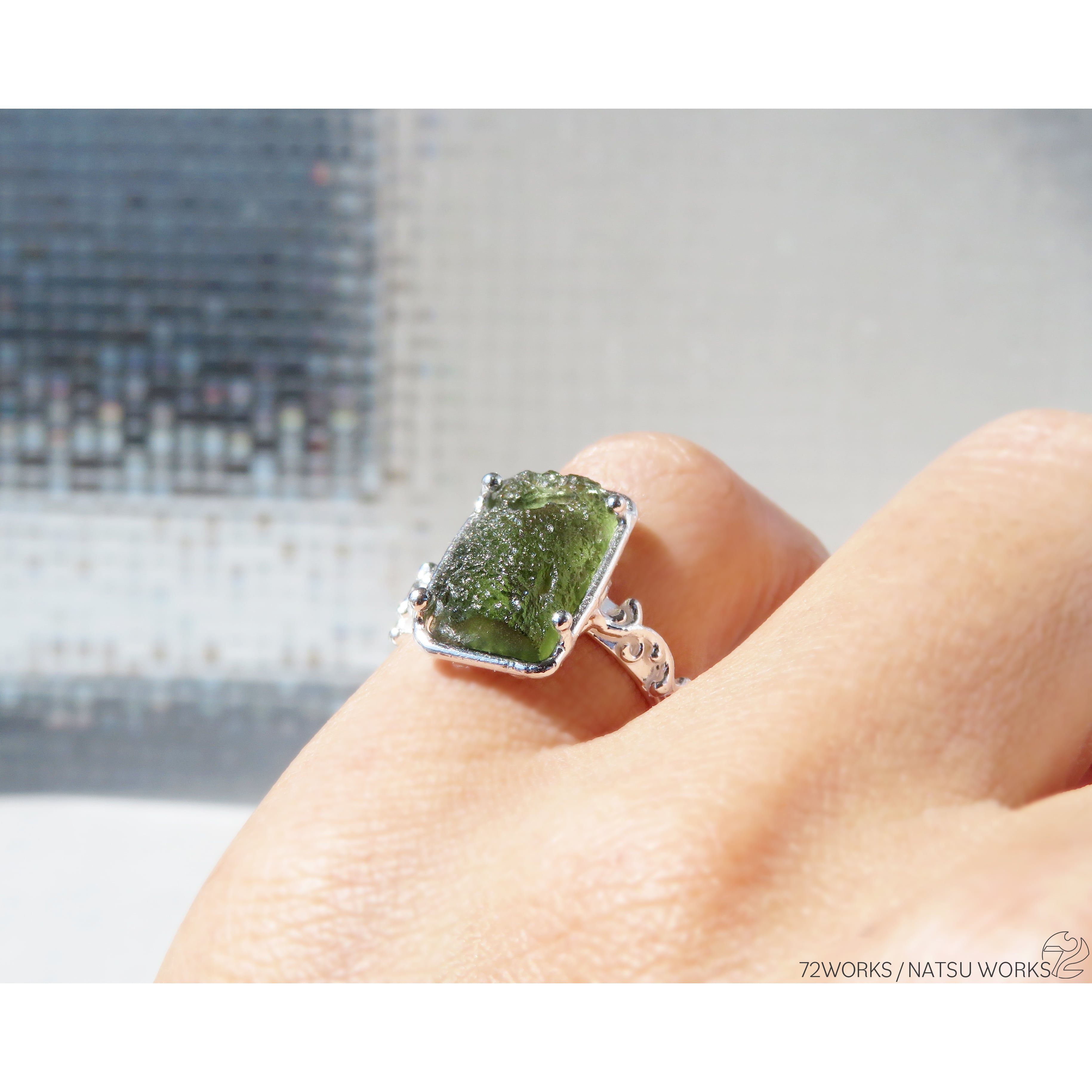 天然の表情が魅力的なモルダバイトを、唐草と透かし模様の台座にセットしたリング。