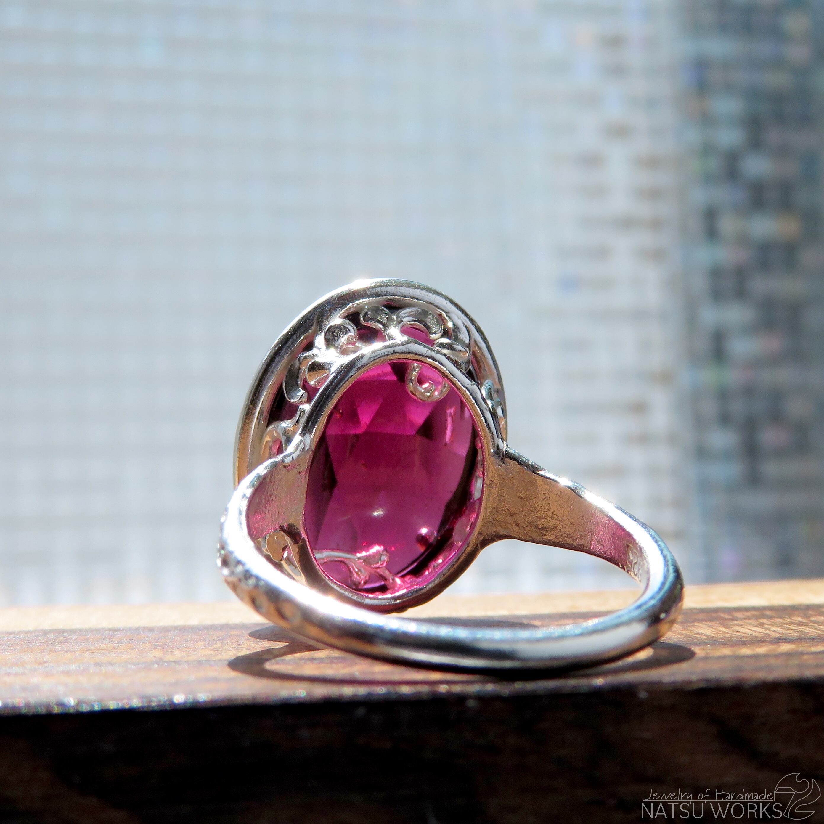 裏をくり抜くような特別なカットによって、暗くなりがちなガーネットが鮮やかに輝きます。