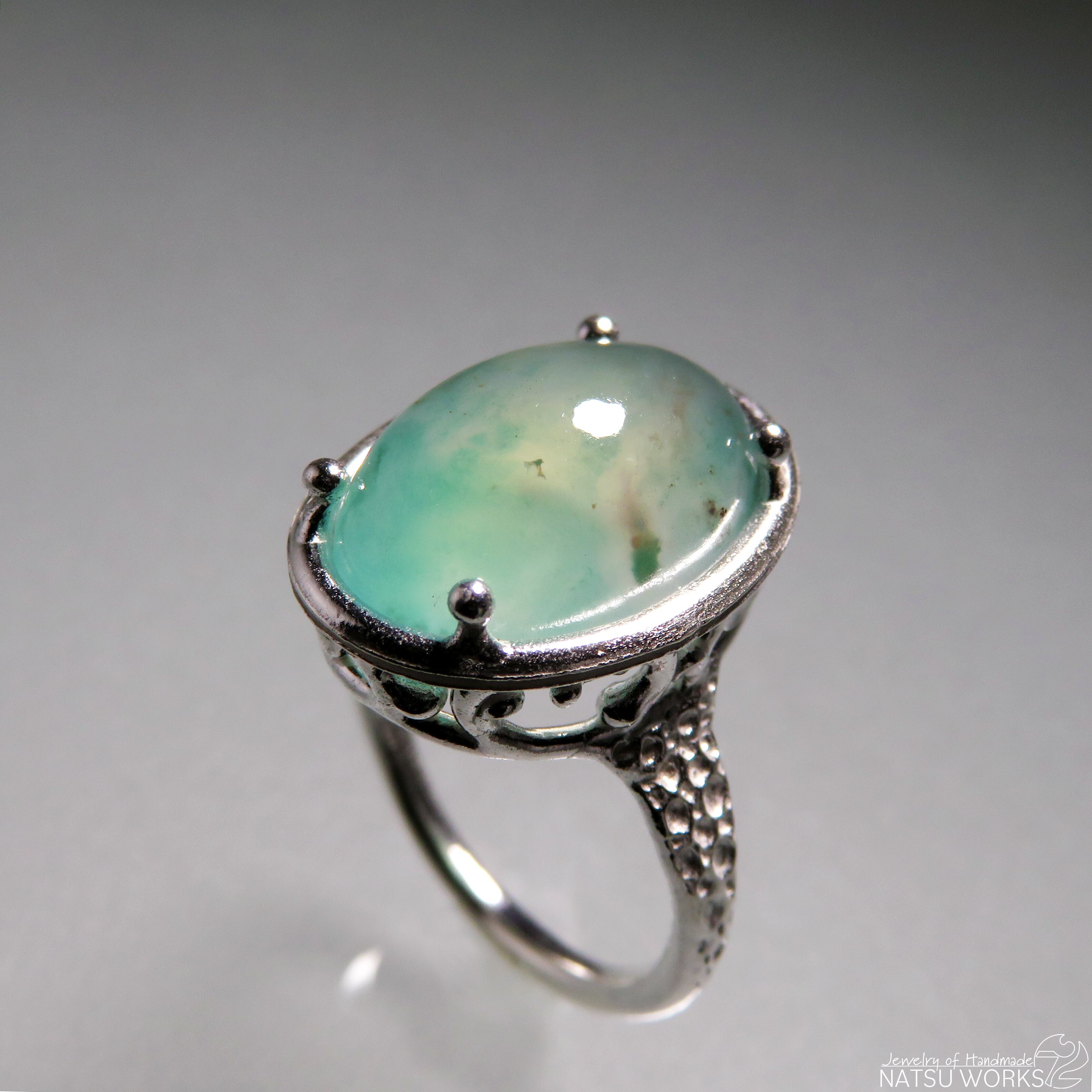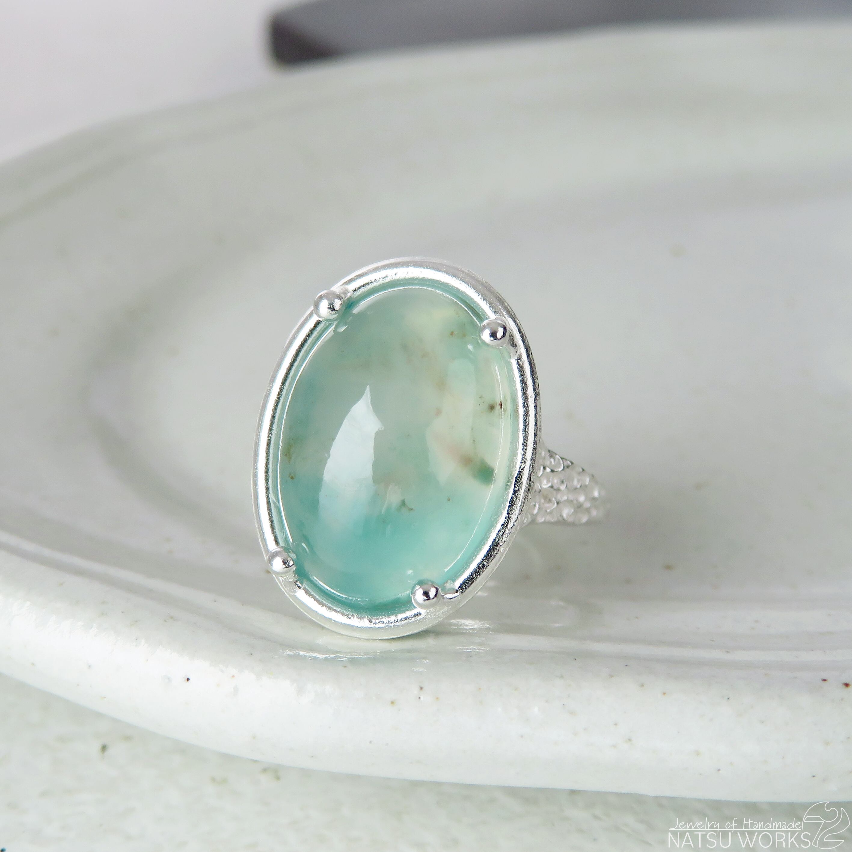 淡く爽やかなブルーのグラデーションが印象的なアクアプレーズを、唐草と透かし模様の台座にセットしたリング。