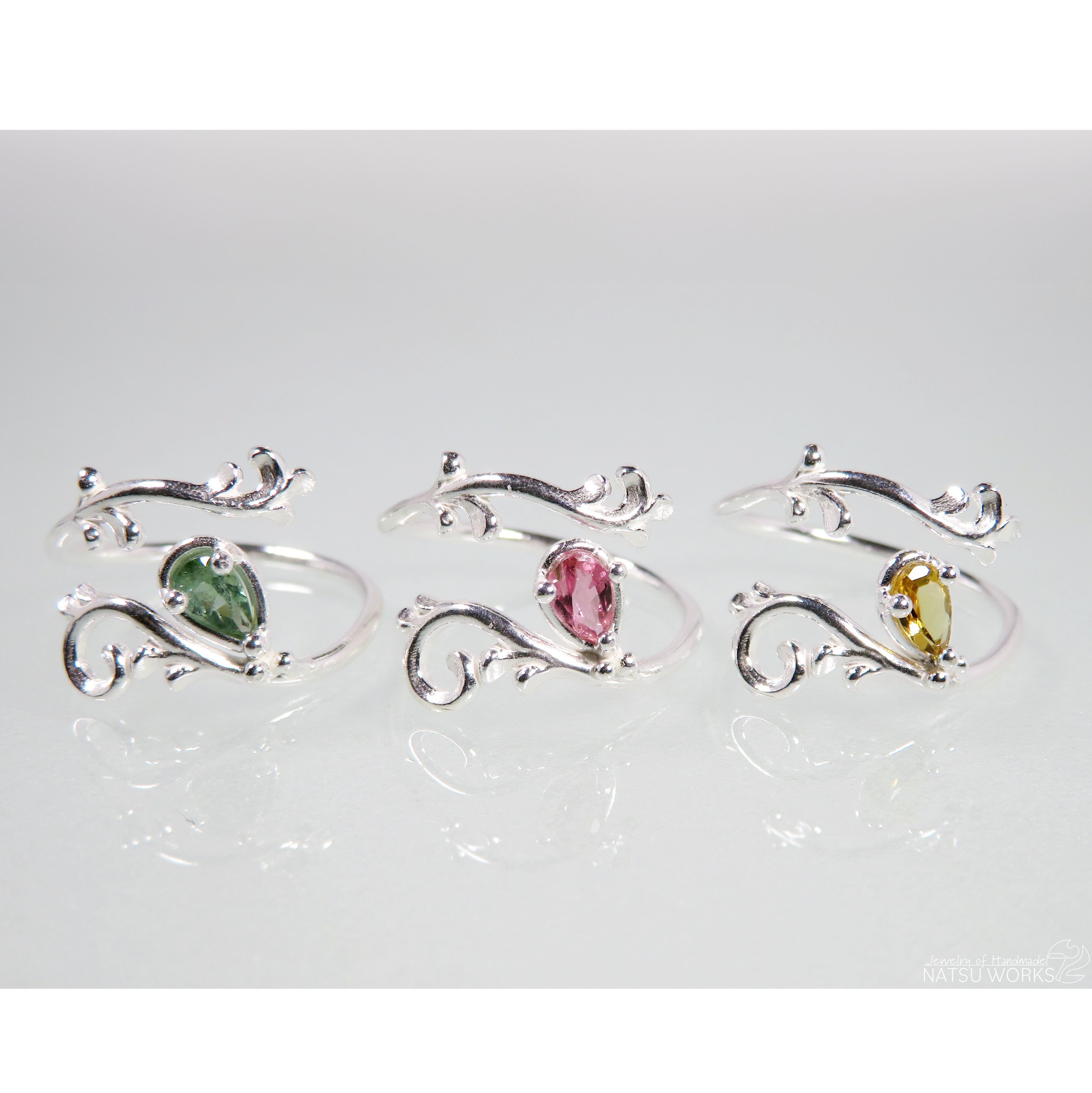 ピンクのトルマリンを使用した、ボタニカルなイメージのフリーサイズ・リング。