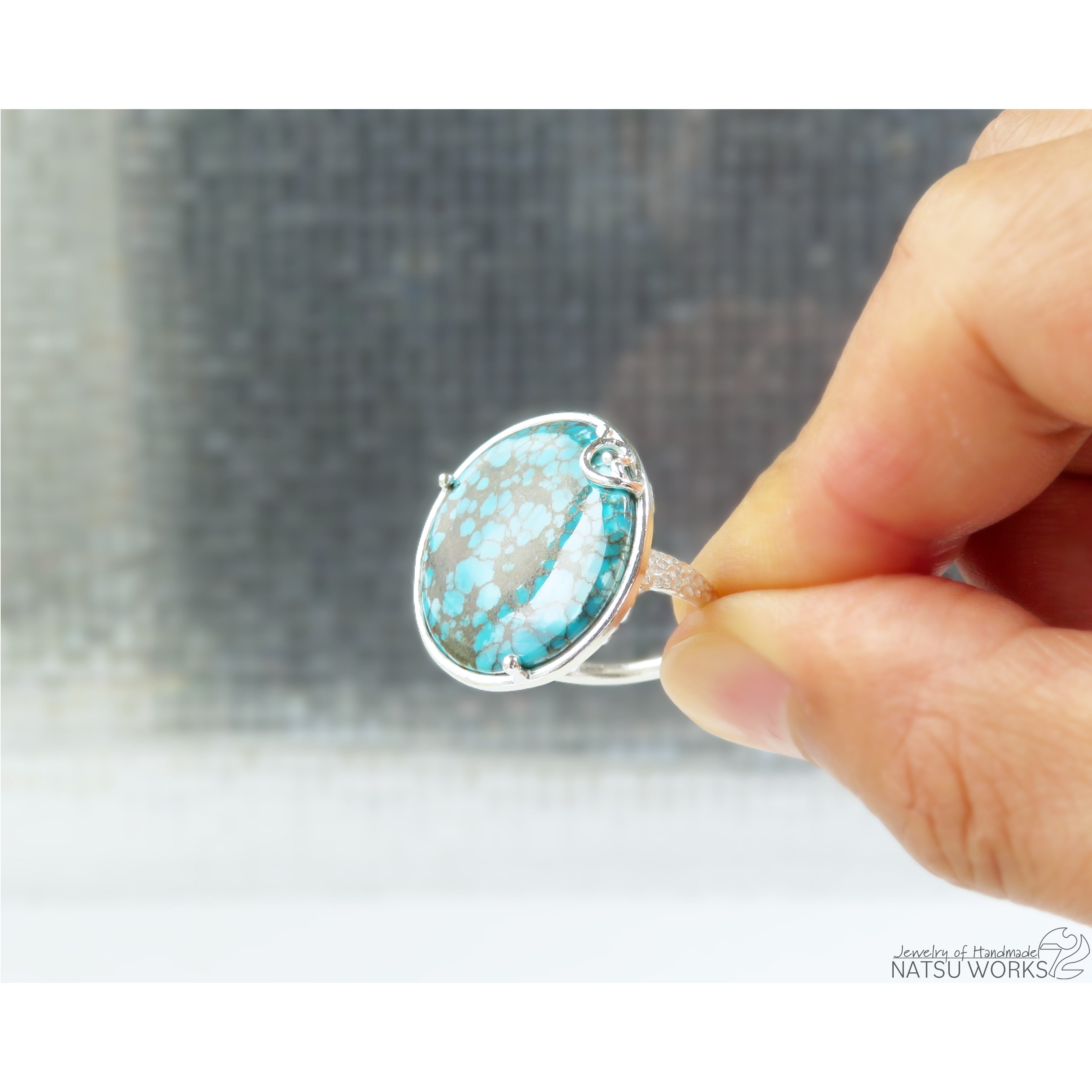 鮮やかなブルーのチベット産・ターコイズを、唐草と透かし模様の台座にセットしたリング。
