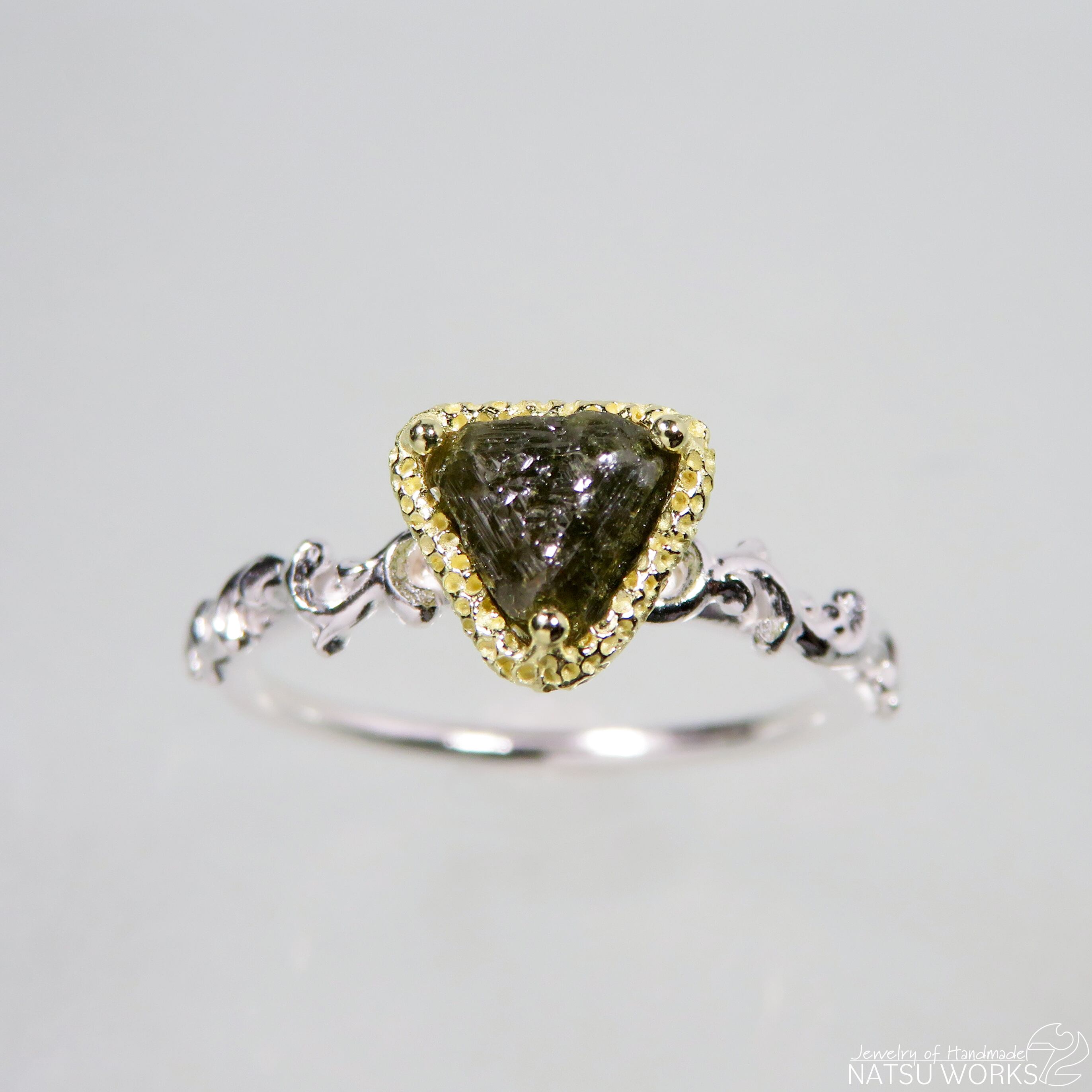 ダイヤモンドの原石をゴールドとシルバーのコンビネーションのリングにセットしました。