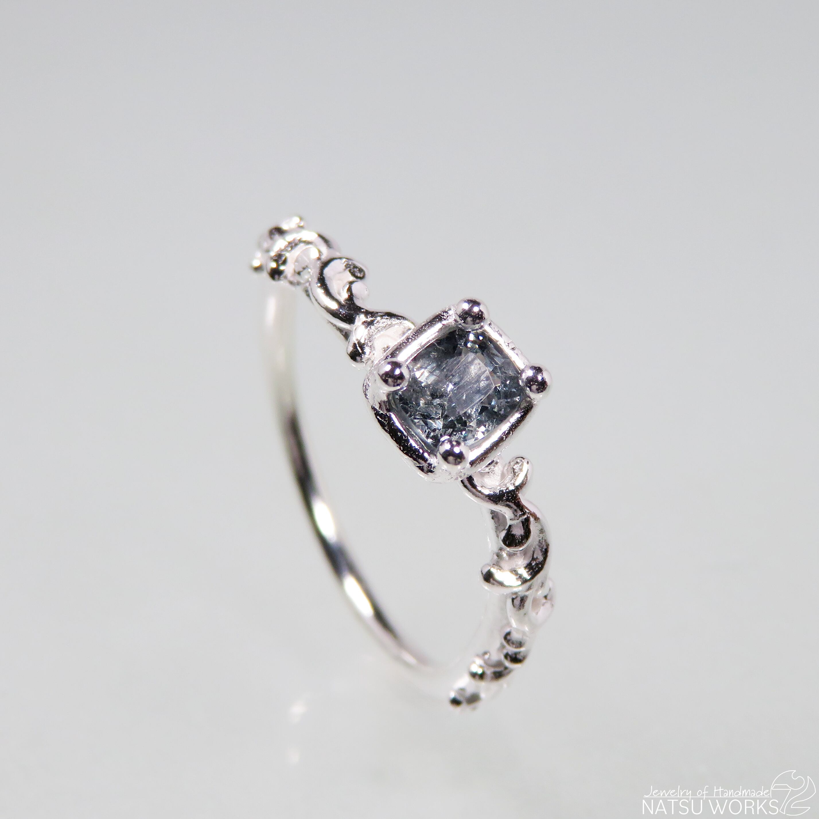 グレーがかったブルーに輝くスピネルを、唐草の細身のアームにセットしました。