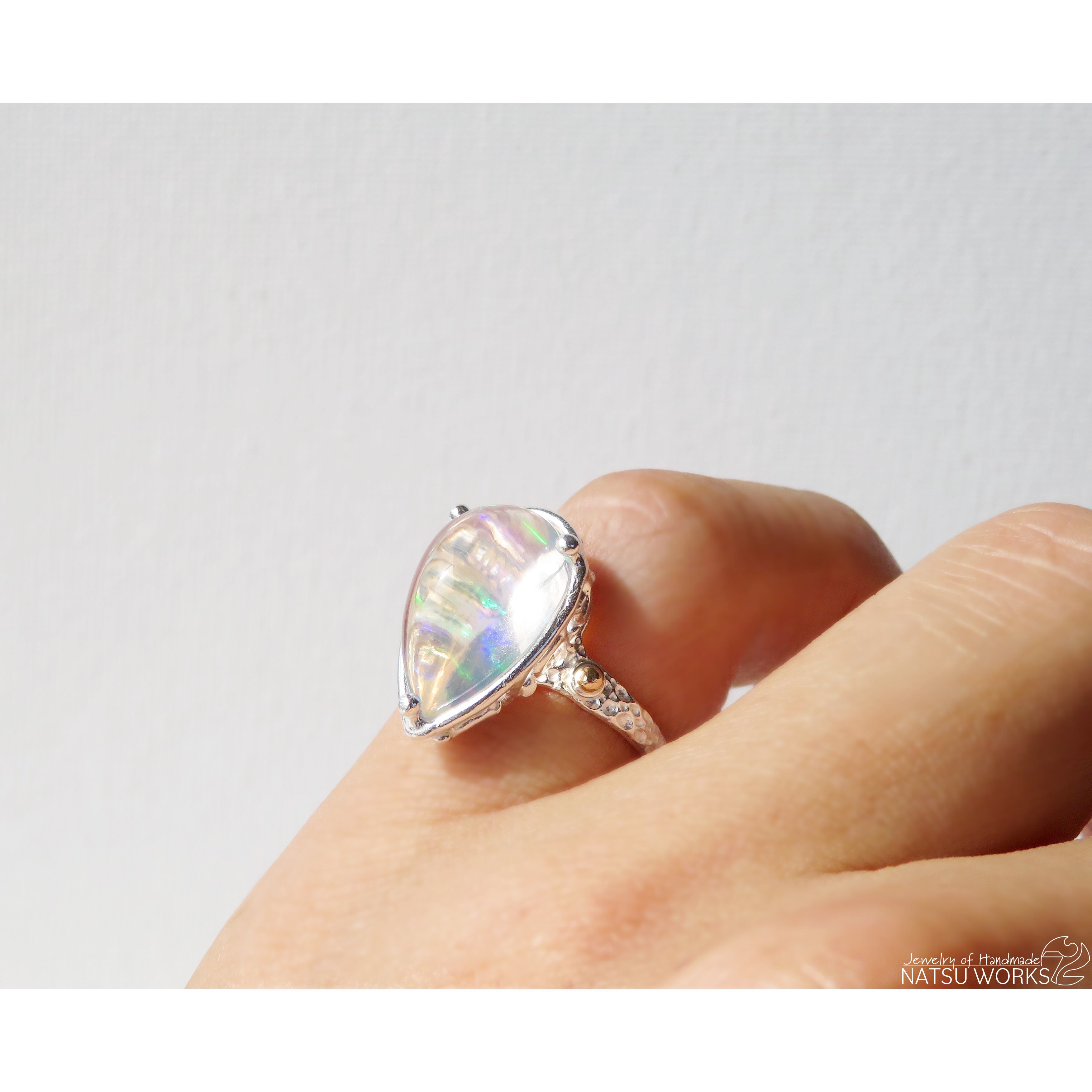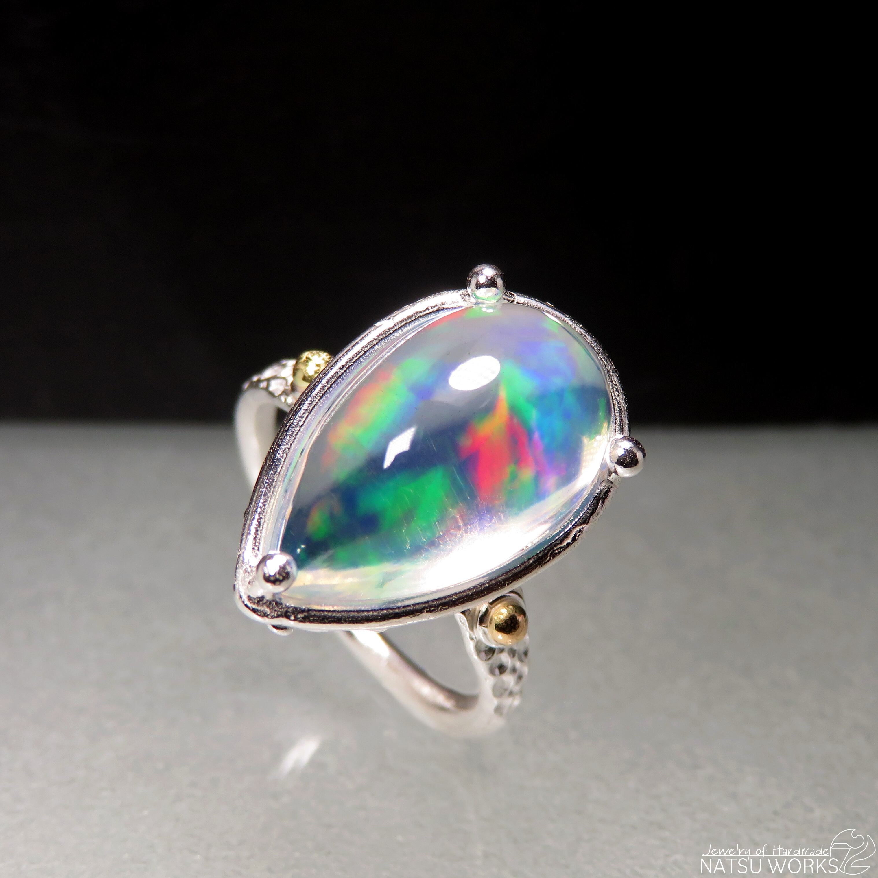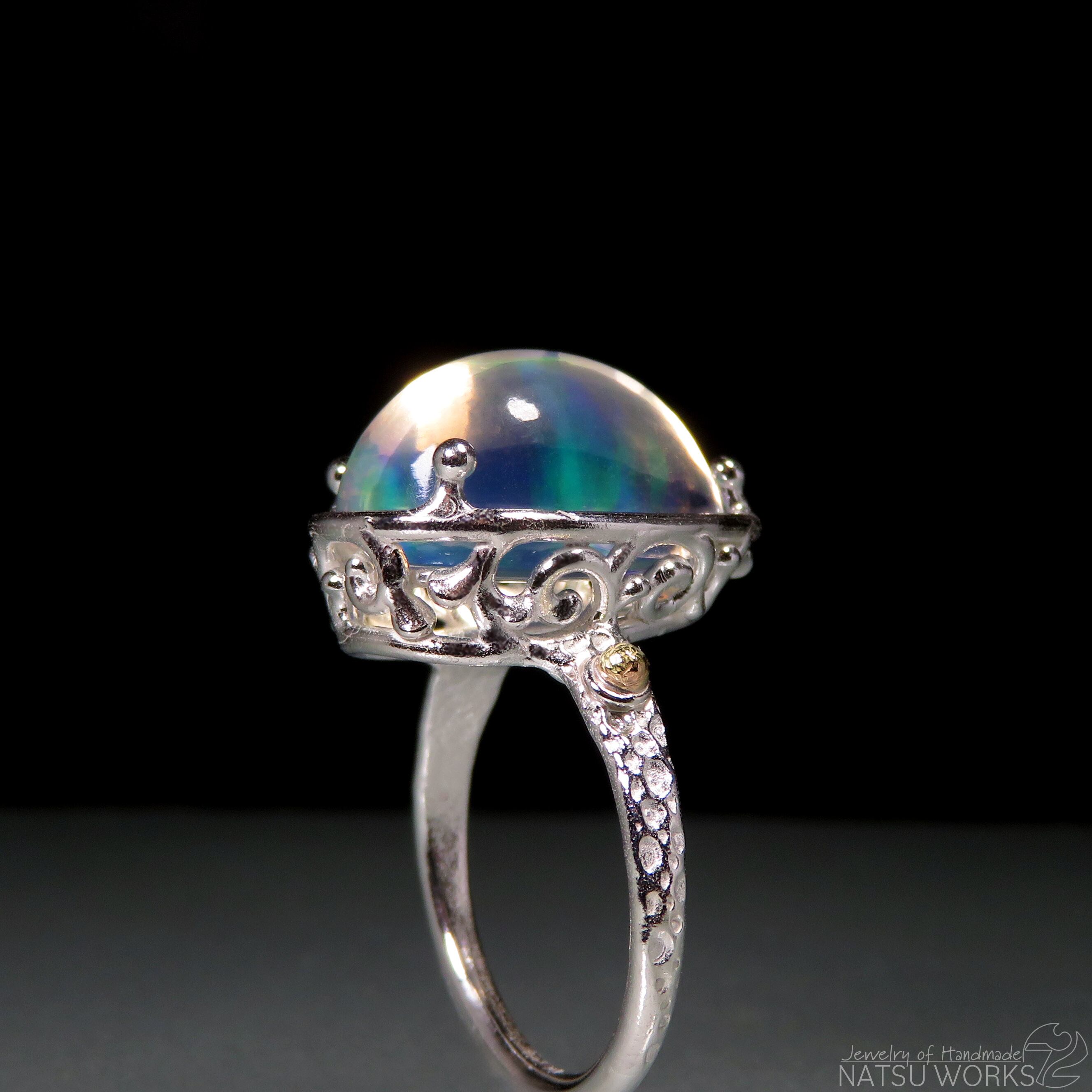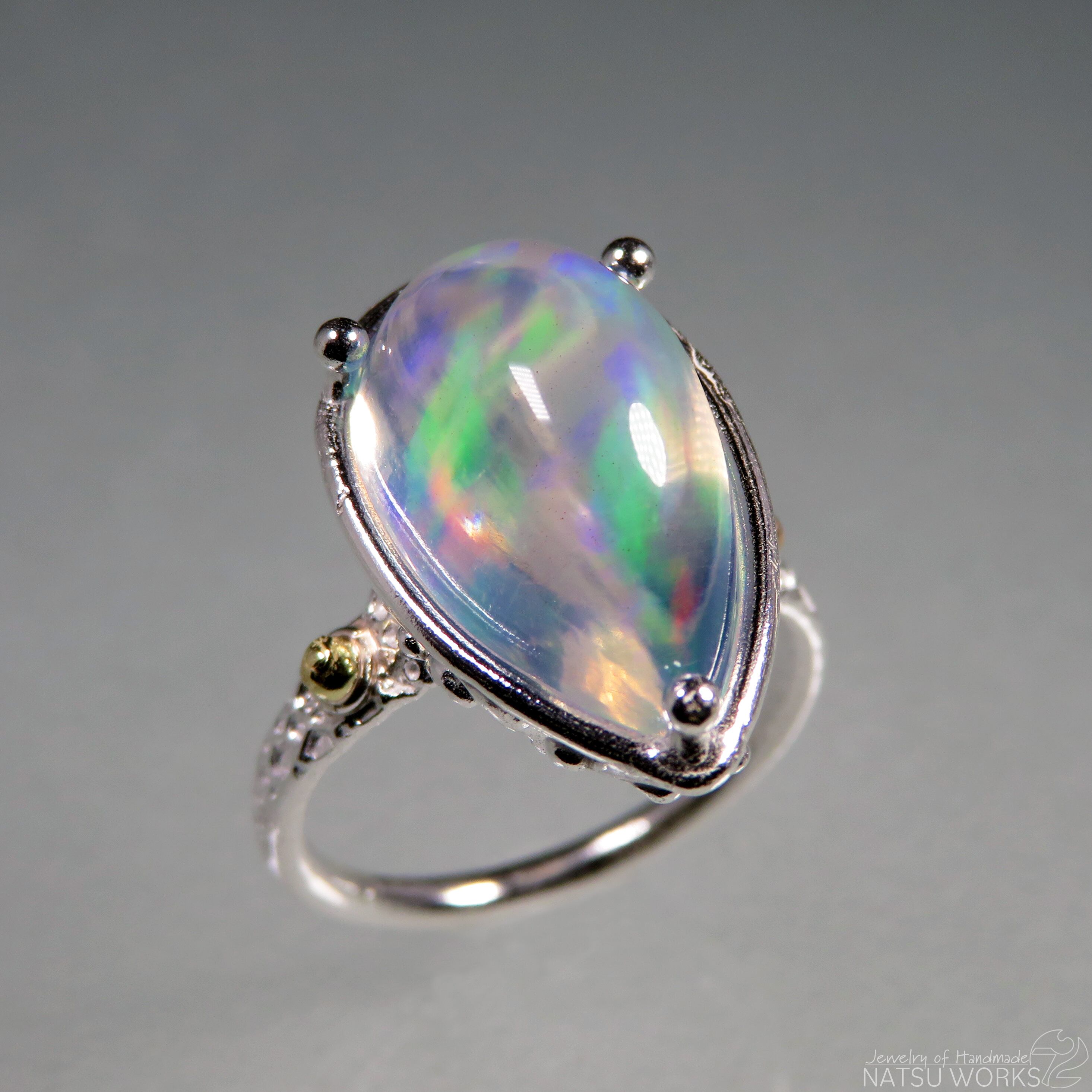 高い透明度と鮮やかな遊色をもつウォーターオパールを、18金のボールで飾った透かし模様のリングにセットしました。