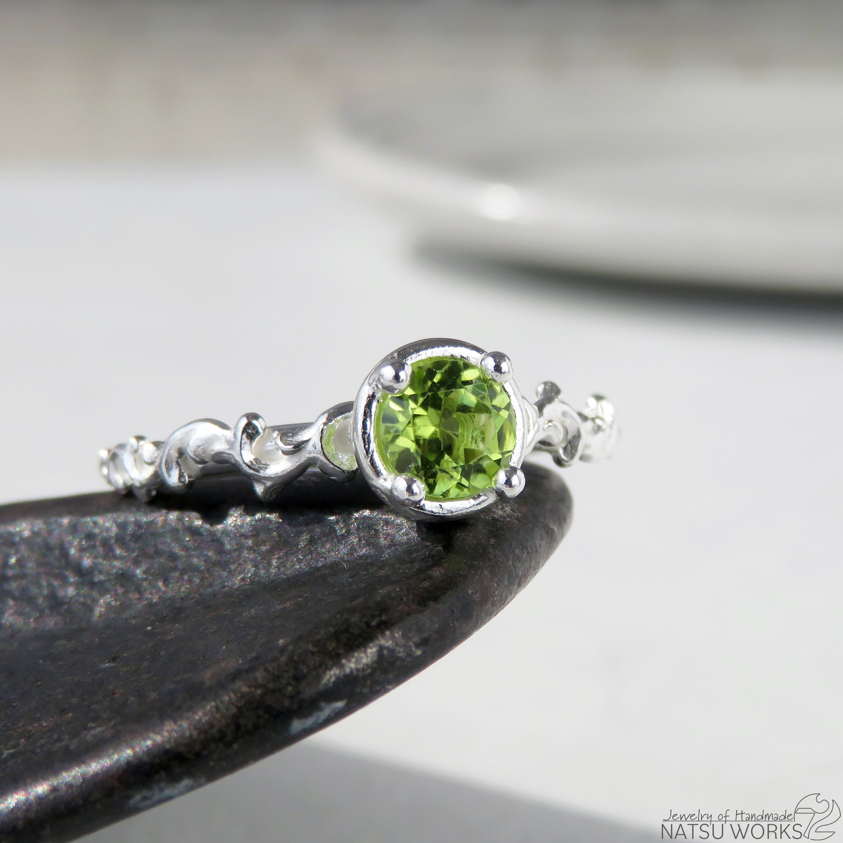 さわやかなグリーンのペリドットを唐草の細身のアームにセットしました。