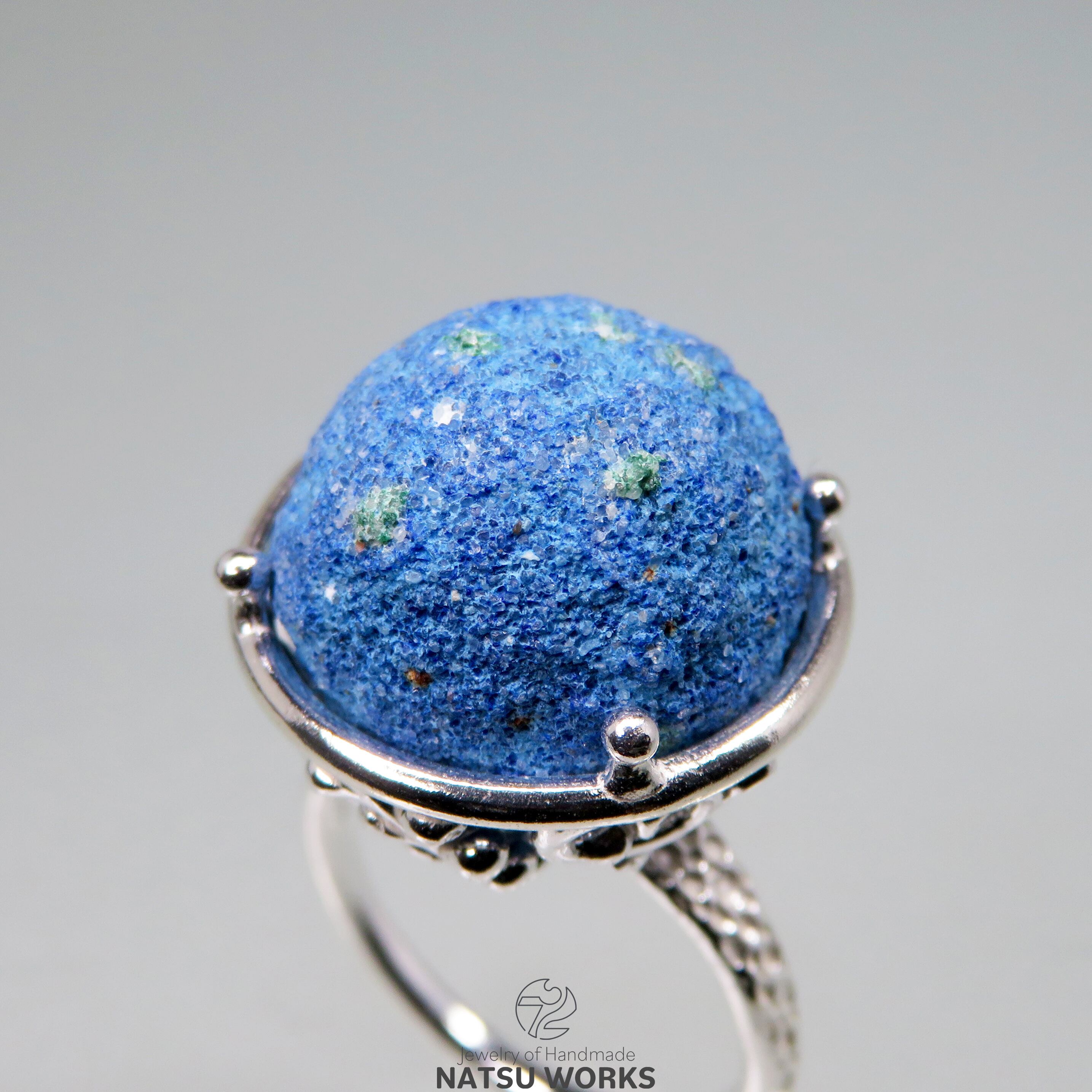 球体状のアズライト原石を、唐草と透かし模様の台座にセットしたリング。